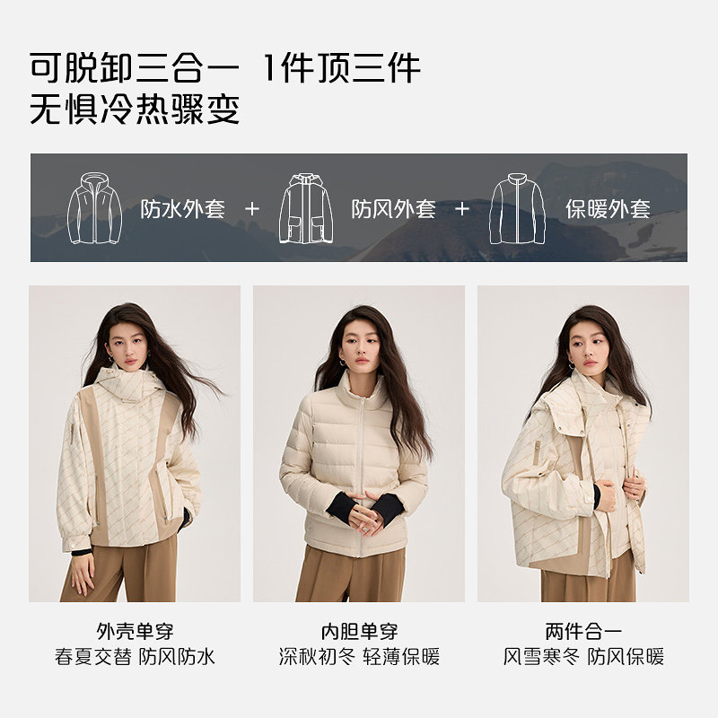 艾莱依户外鹅绒羽绒服女新款 保暖百搭外套 运动内胆两件套登山工装