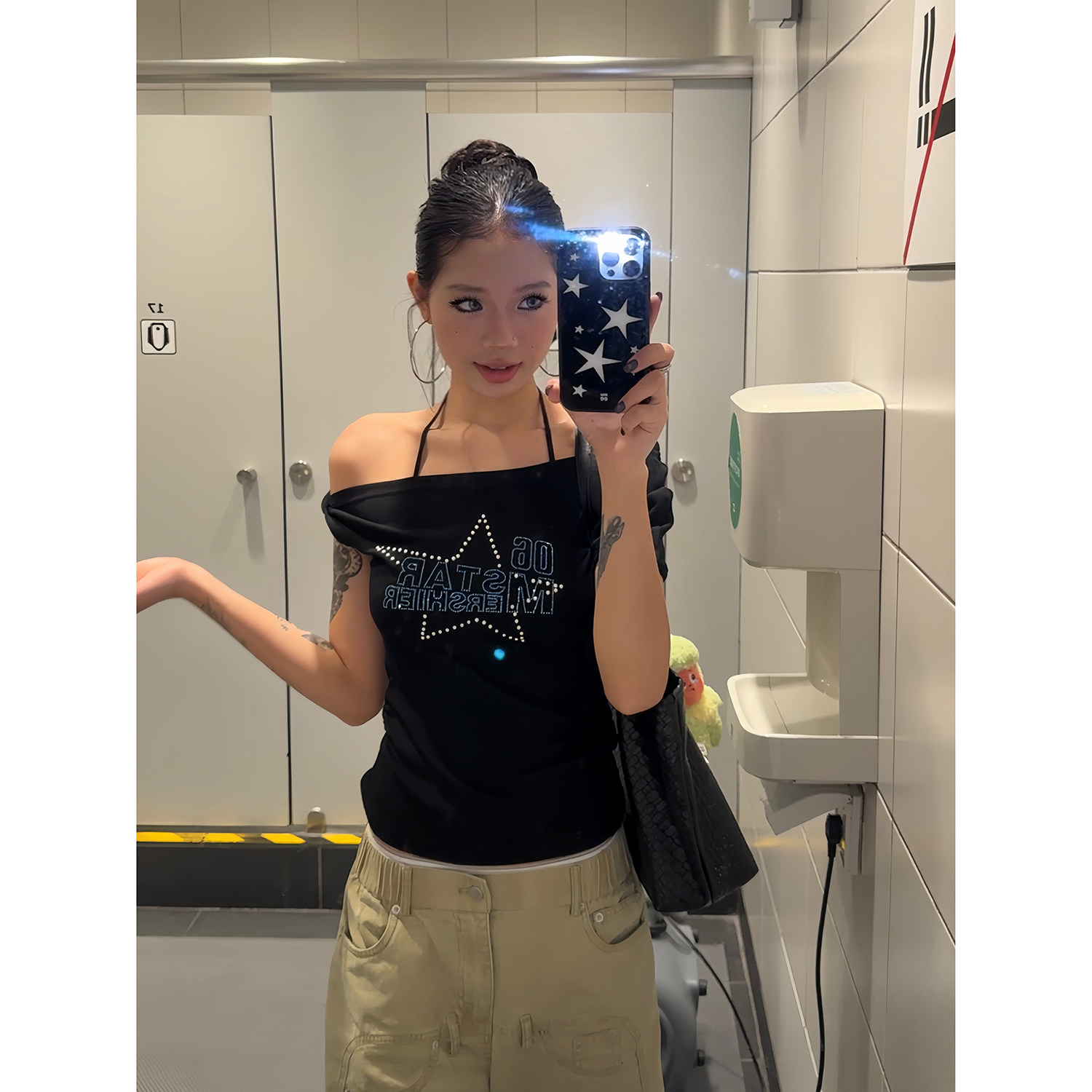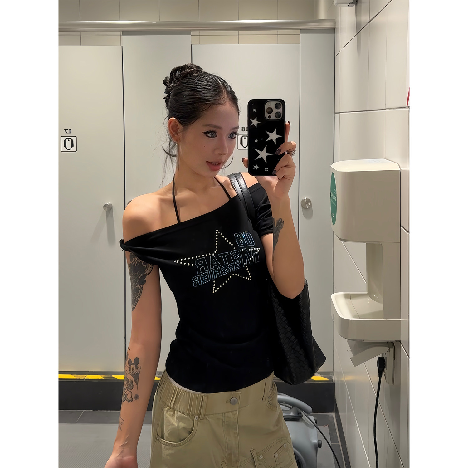 百搭修身 复古斜肩五角星烫钻T恤短袖 收腰显瘦上衣女ins 美式 F383