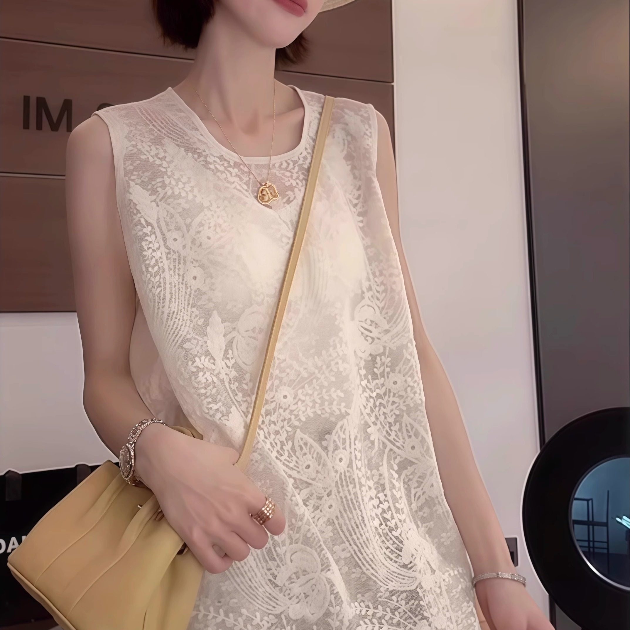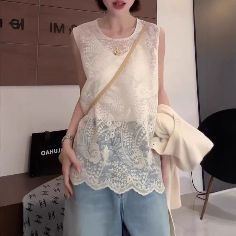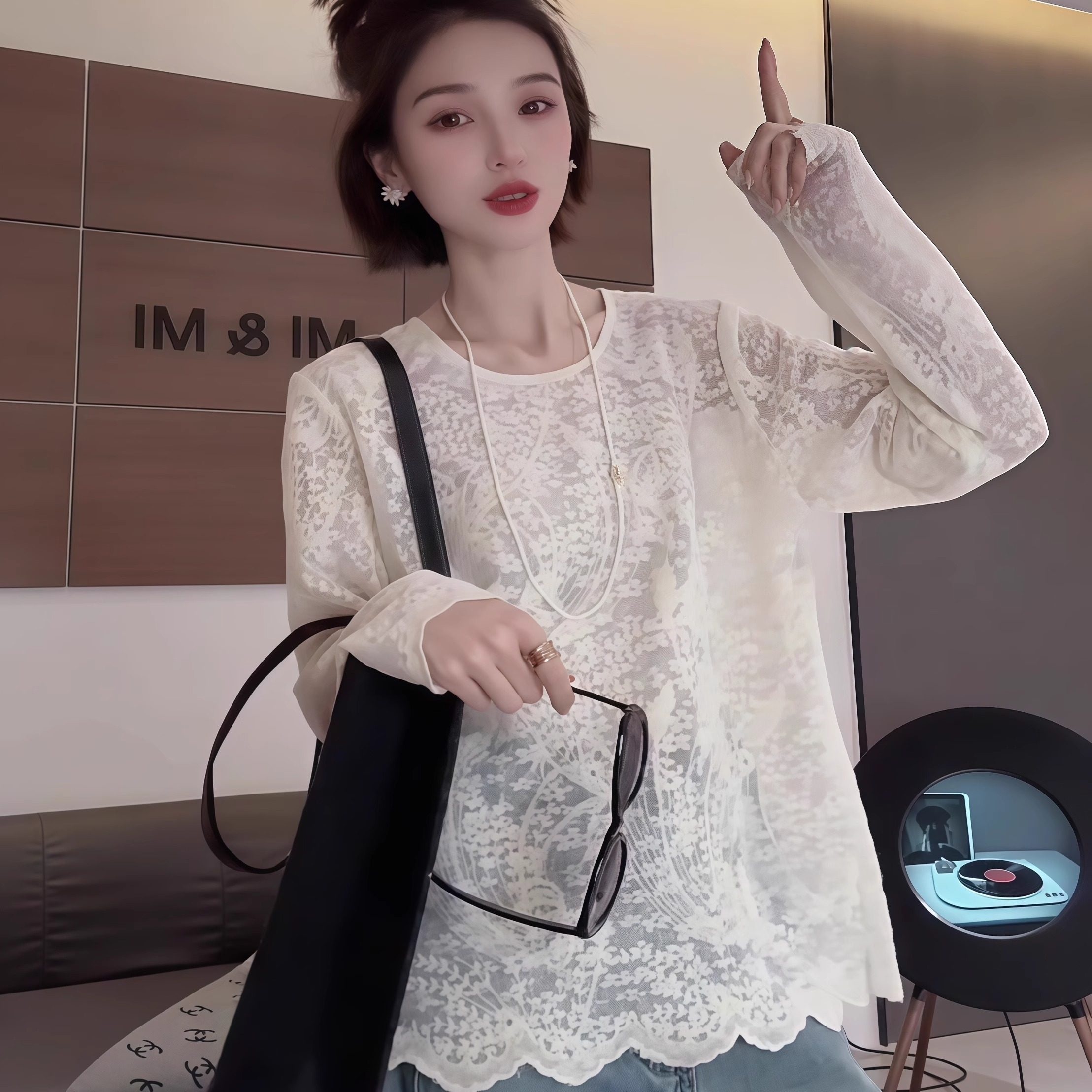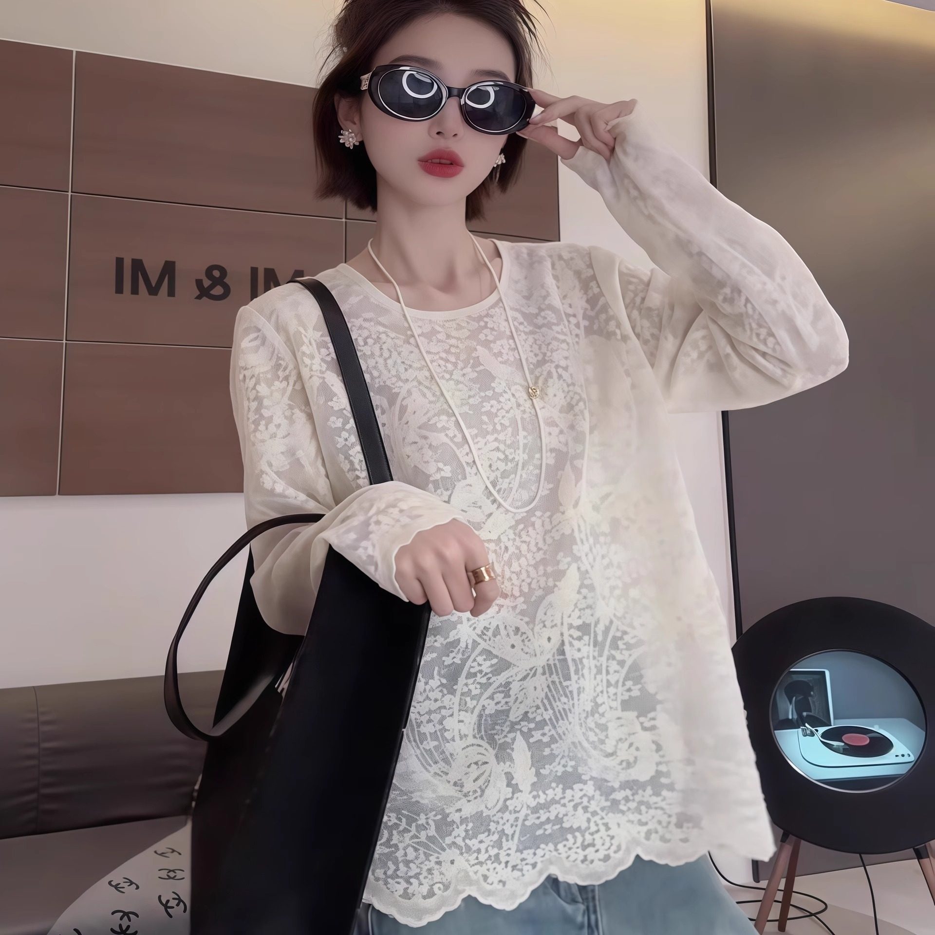 上衣薄 宽松镂空韩系宽松罩衫 蕾丝圆领刺绣防晒长袖 t恤女2025新款