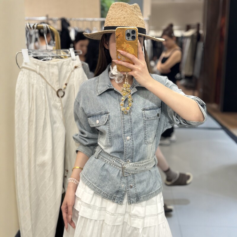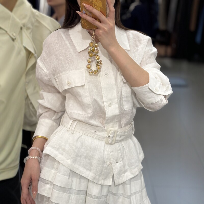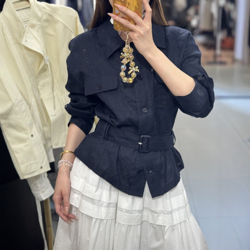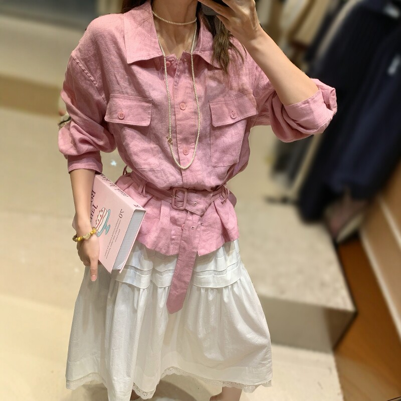 衬衫 欧洲站2025春季 .COM小众设计感亚麻长袖 配腰带收腰上衣 新款