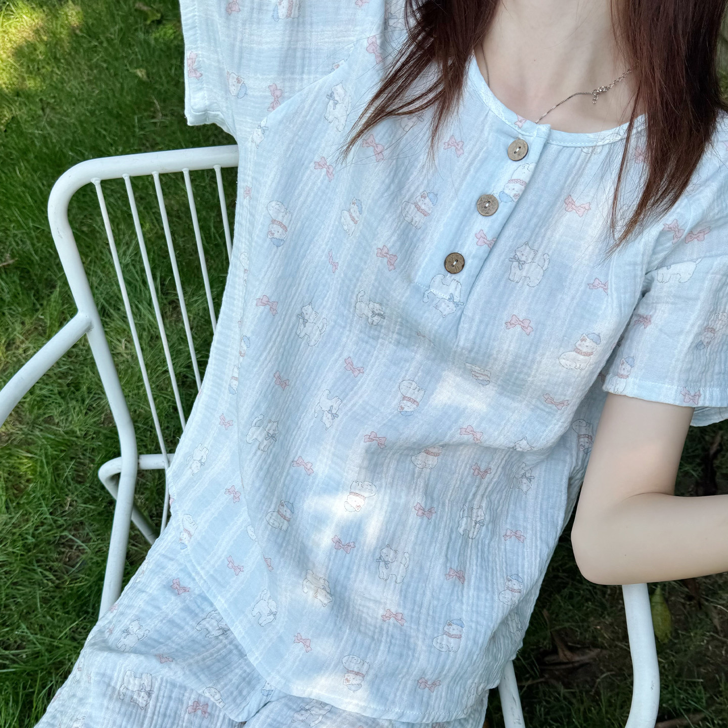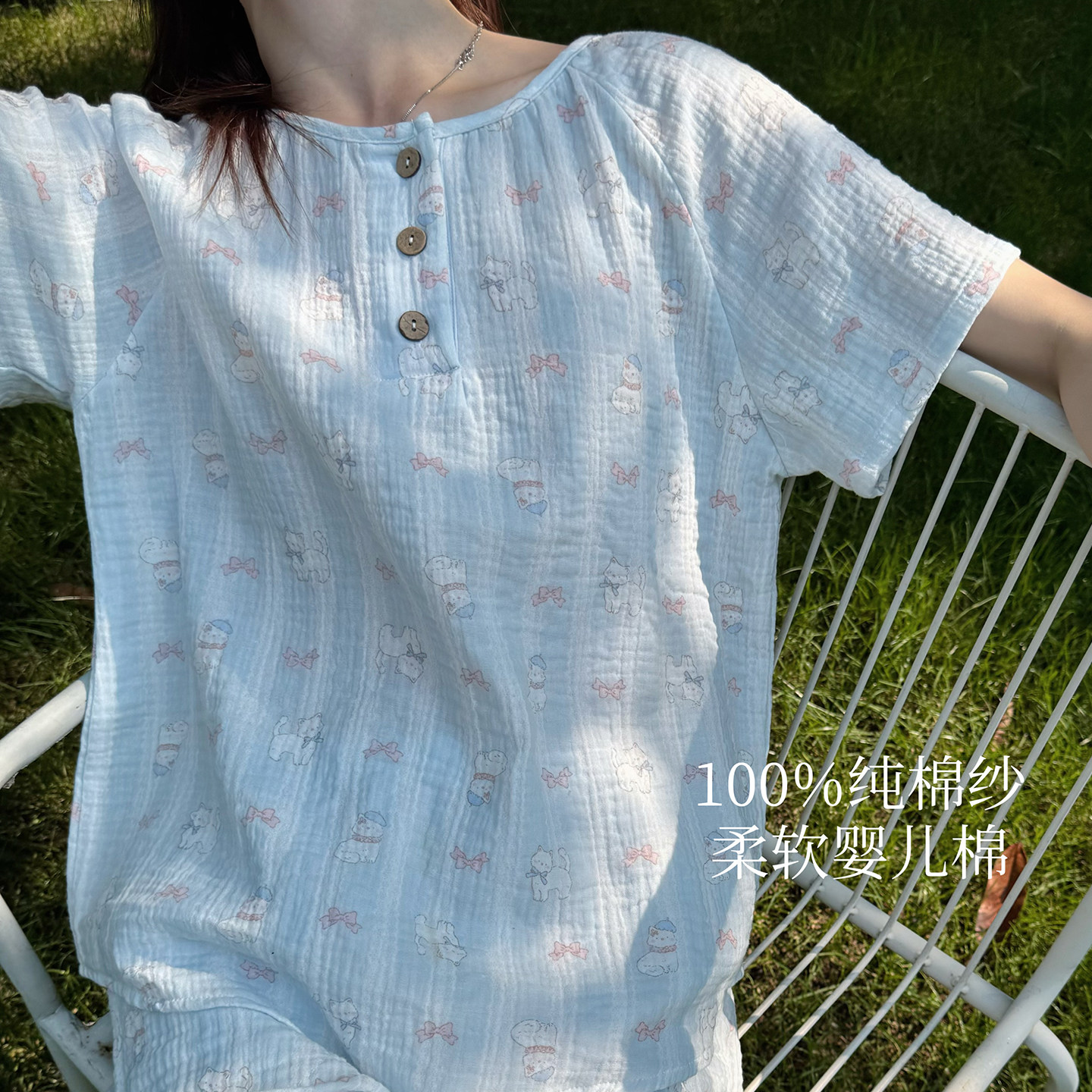 长裤 米图100%纯棉纱 短裤 睡衣女短袖 柔软婴儿棉家居服圆领夏薄款