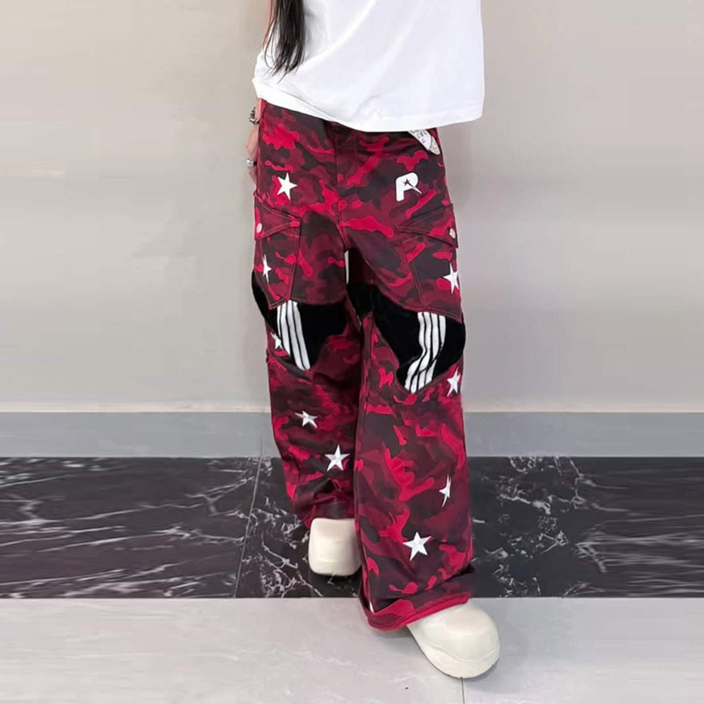 女低腰宽松显瘦跳舞长裤 WEEKEEP 街头小众迷彩星星印花拼接休闲裤