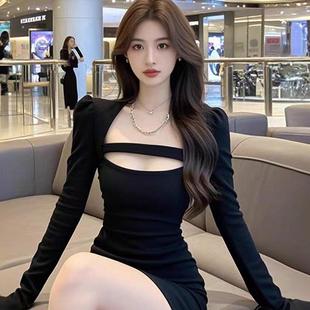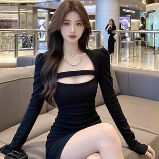 黑色修身 显瘦气质连衣裙女辣妹风镂空性感包臀裙子2024年秋冬新款