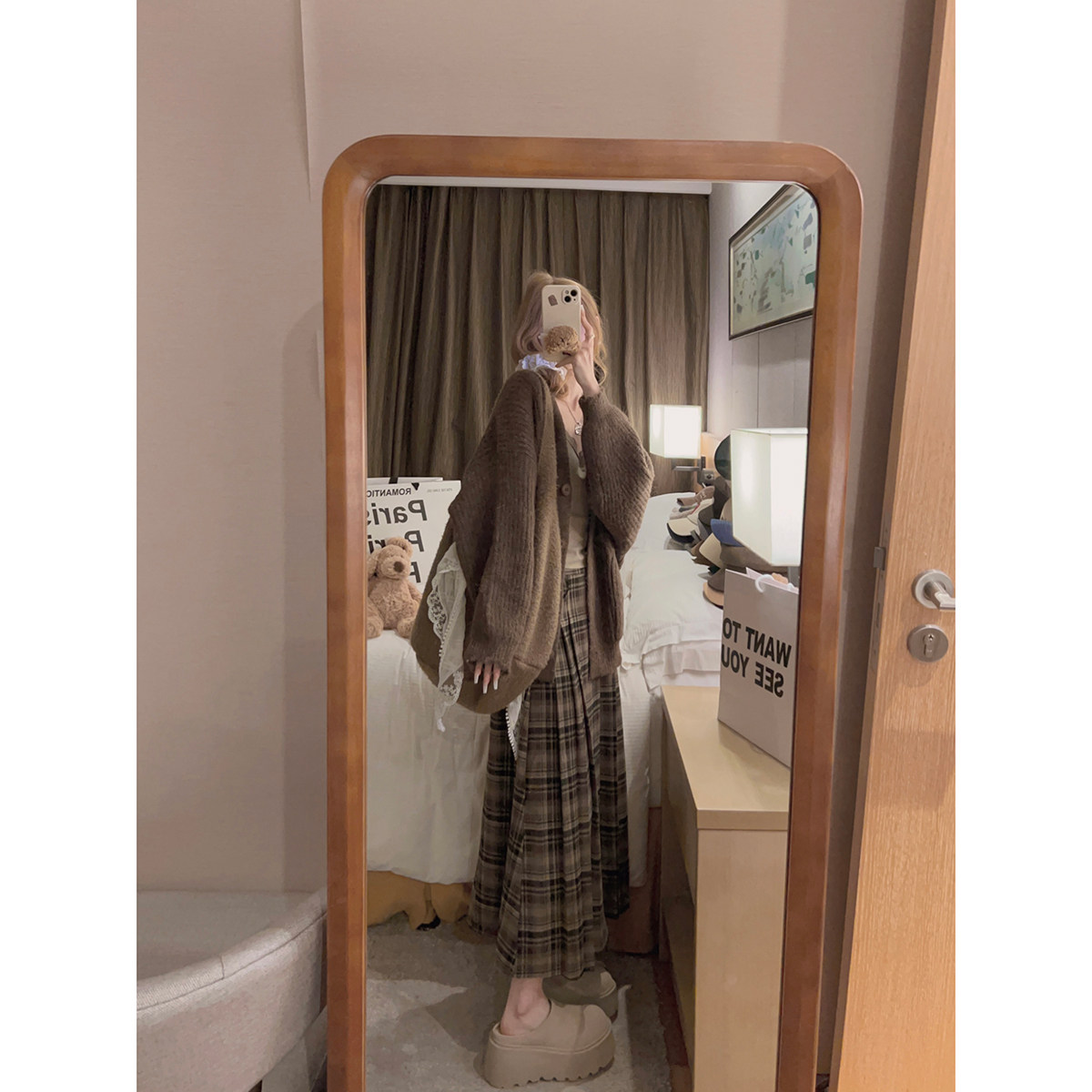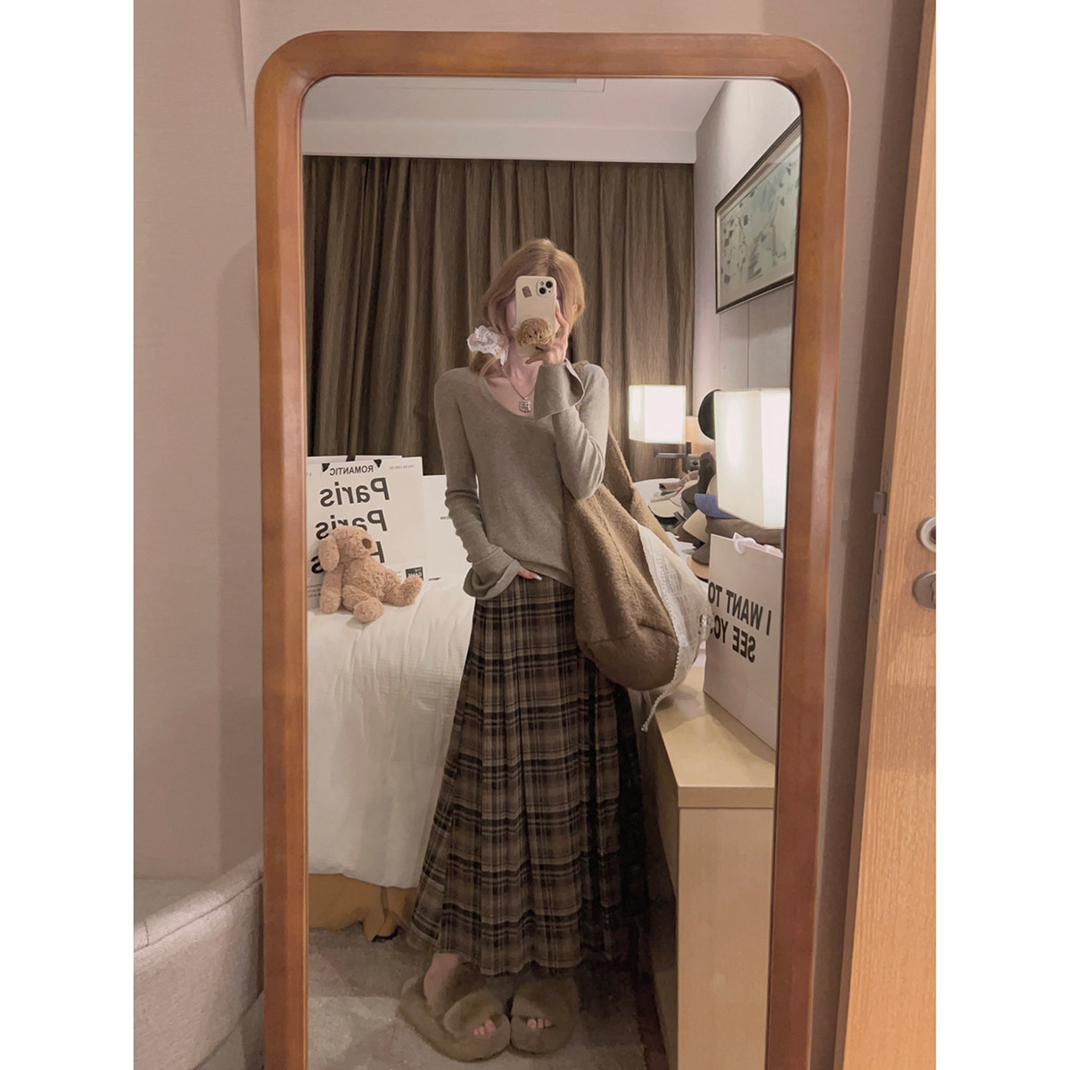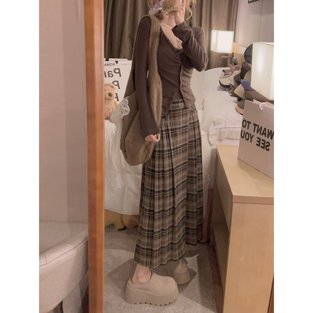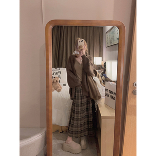 Yukiss 复古艺术生学院咖色百褶格纹长裙半身裙 福利清仓5折