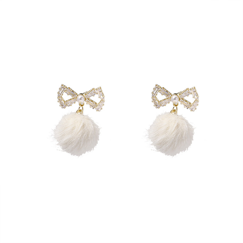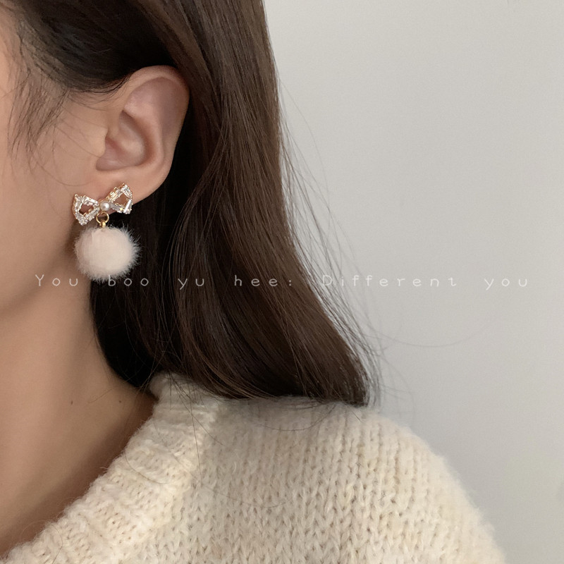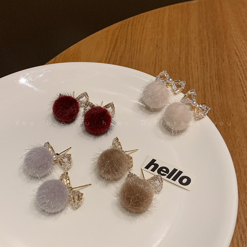 2025新款 蝴蝶结毛绒毛球耳钉女小众高级感可爱耳环甜美独特耳饰品