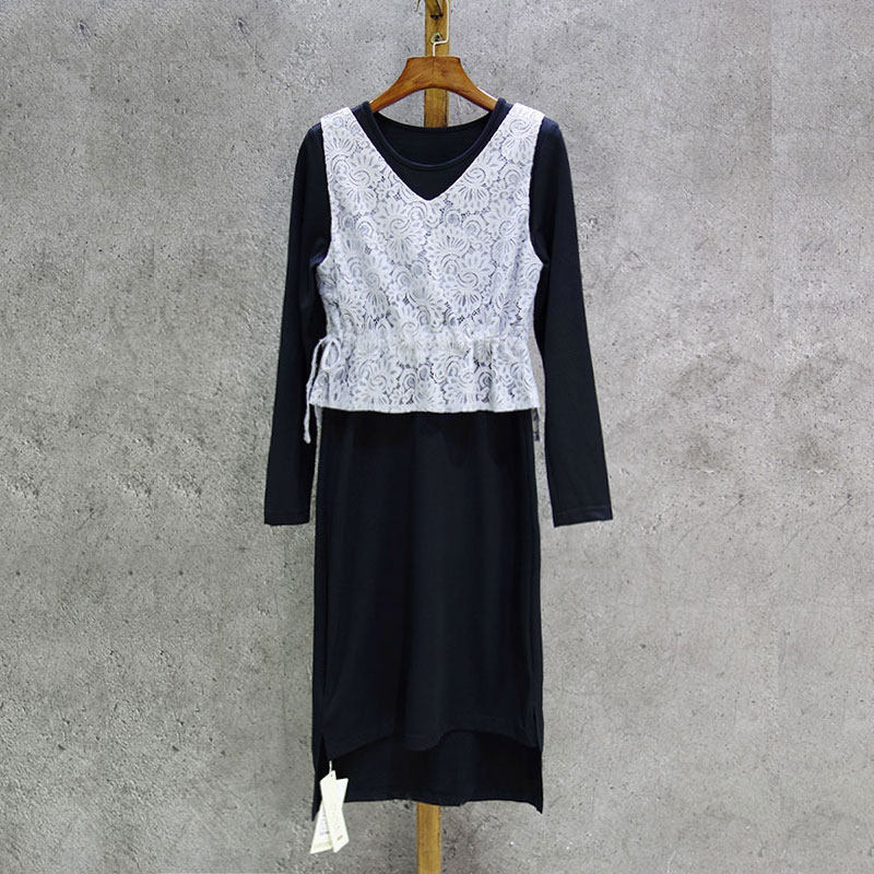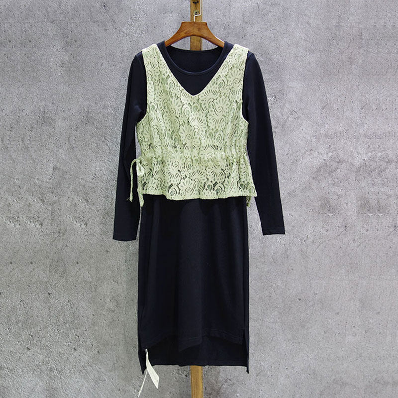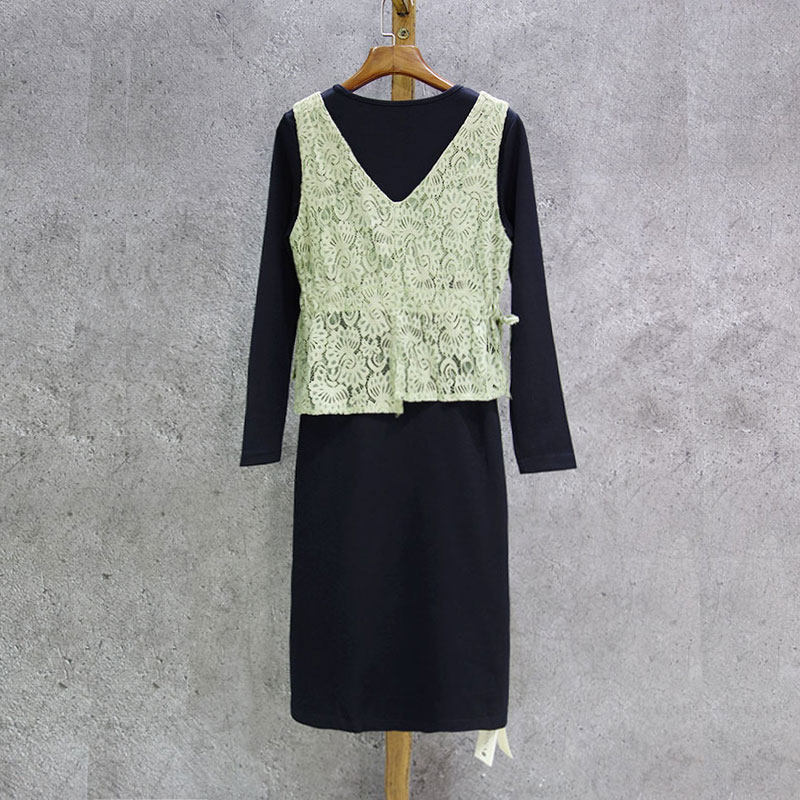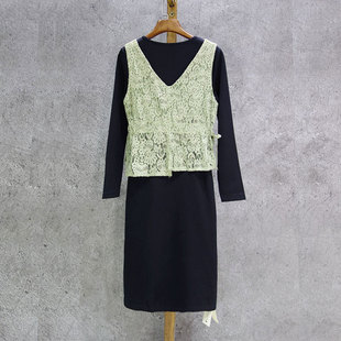 优雅范 春秋夏 V领系带蕾丝衫 长款 套裙 纤衣姐姐 针织连衣裙 奥