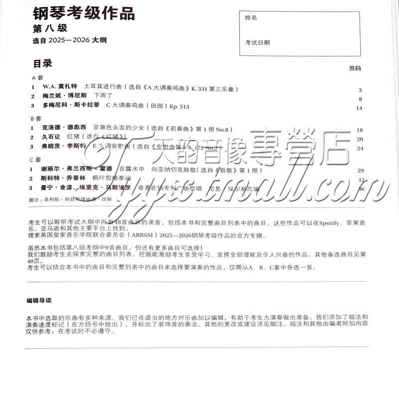 2025 英皇钢琴考级作品 2026 第八级 新版 8级曲目曲谱中文版 正版