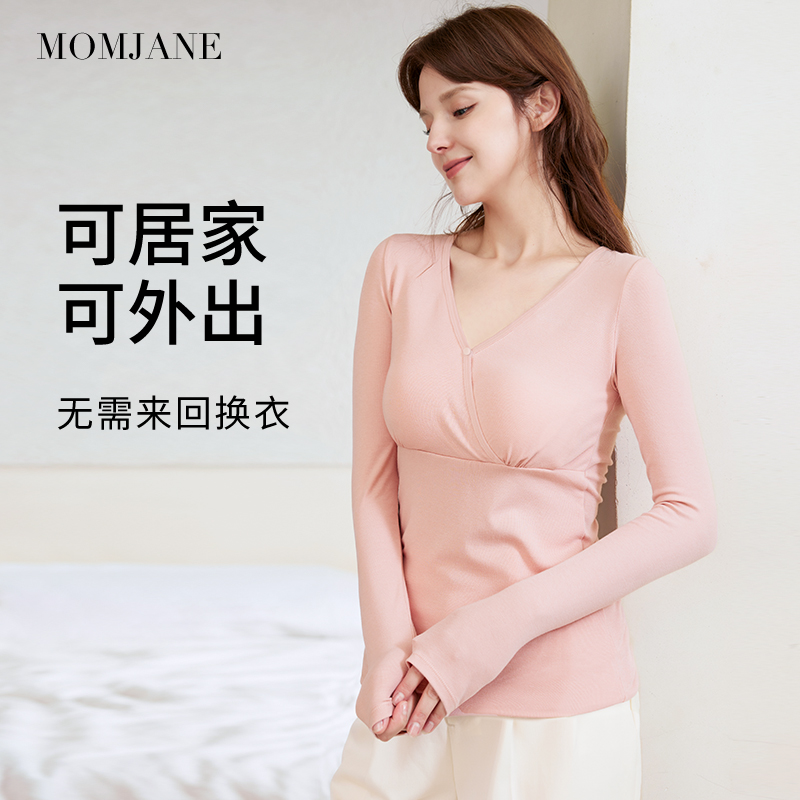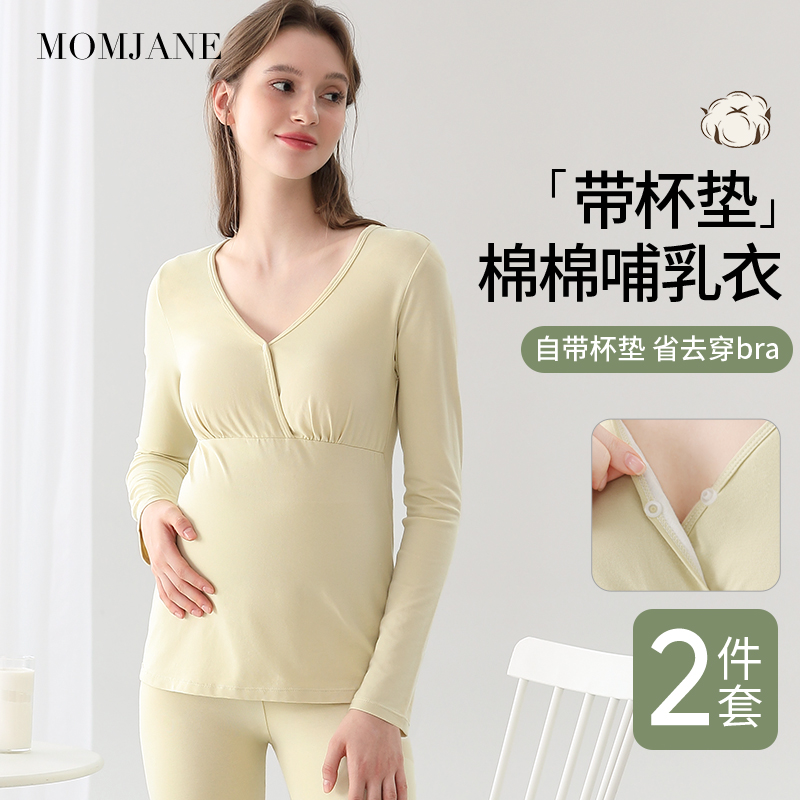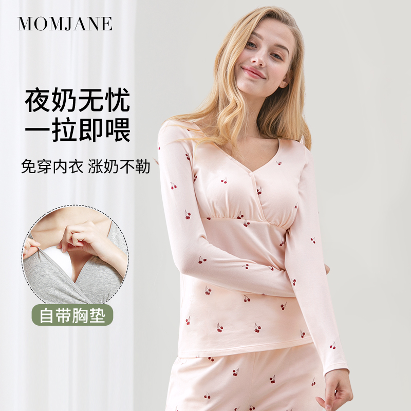 哺乳上衣秋衣打底衫 孕妇保暖内衣外出产后月子服带胸垫 纯棉秋冬款