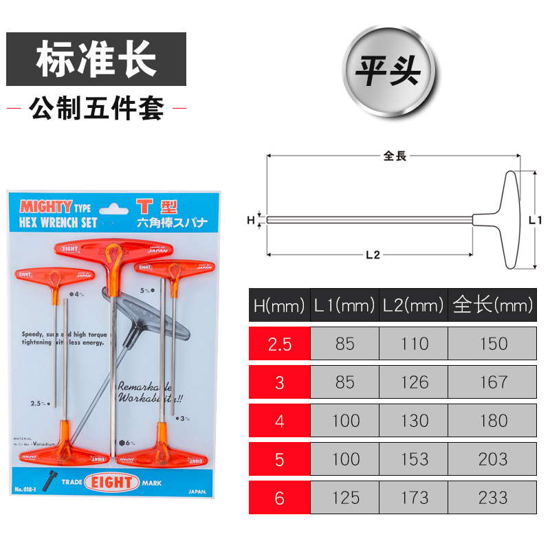 日本EIGHT百利T型内六角扳手进口加长T柄平头螺丝刀018L 2.53468m