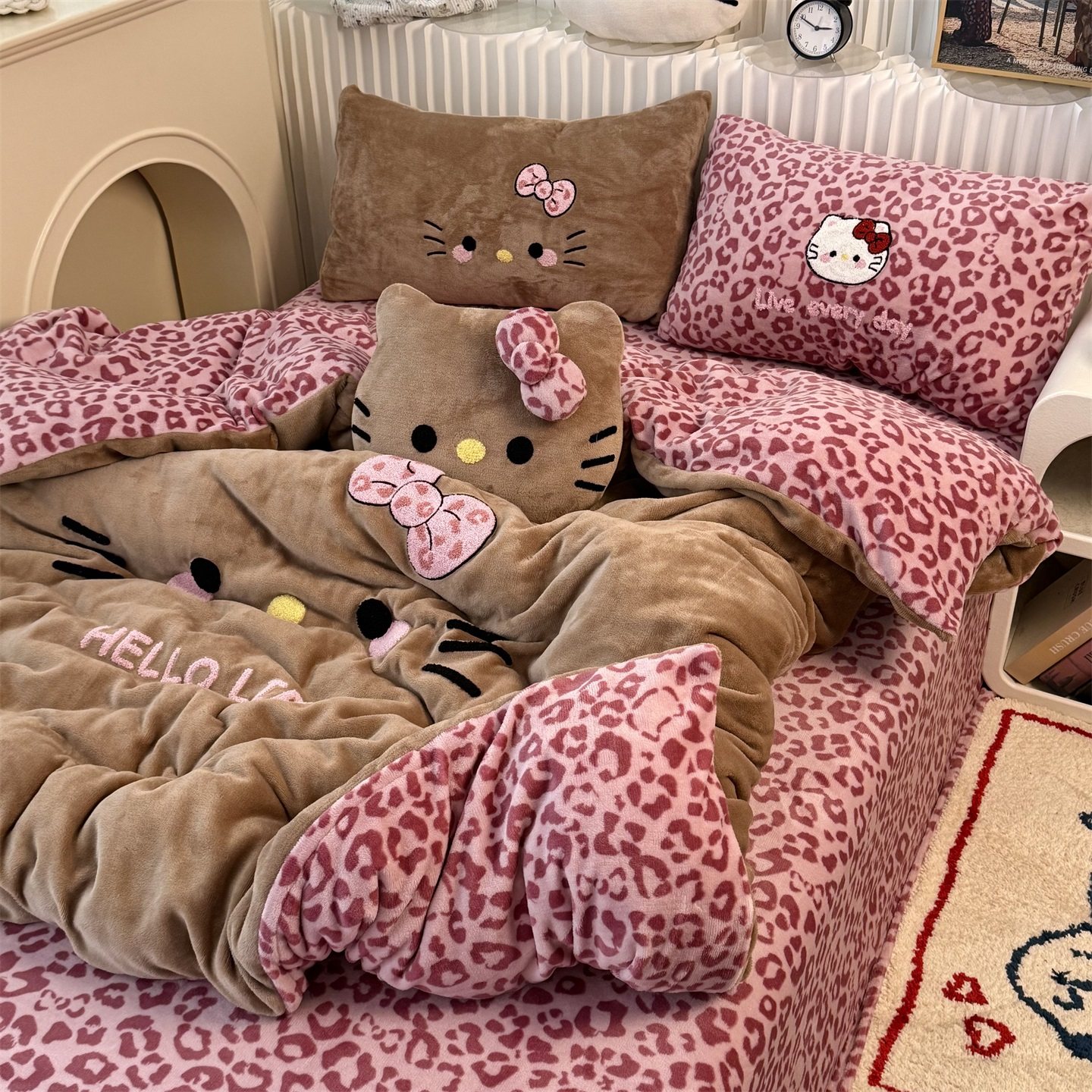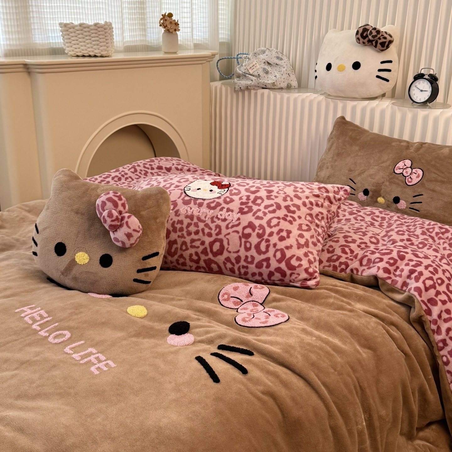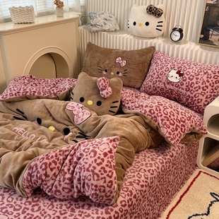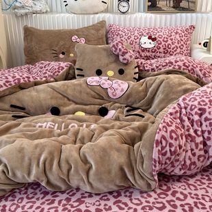 少女ins韩系可爱黑皮KT猫咪毛巾绣牛奶绒四件套冬天珊瑚绒三件套
