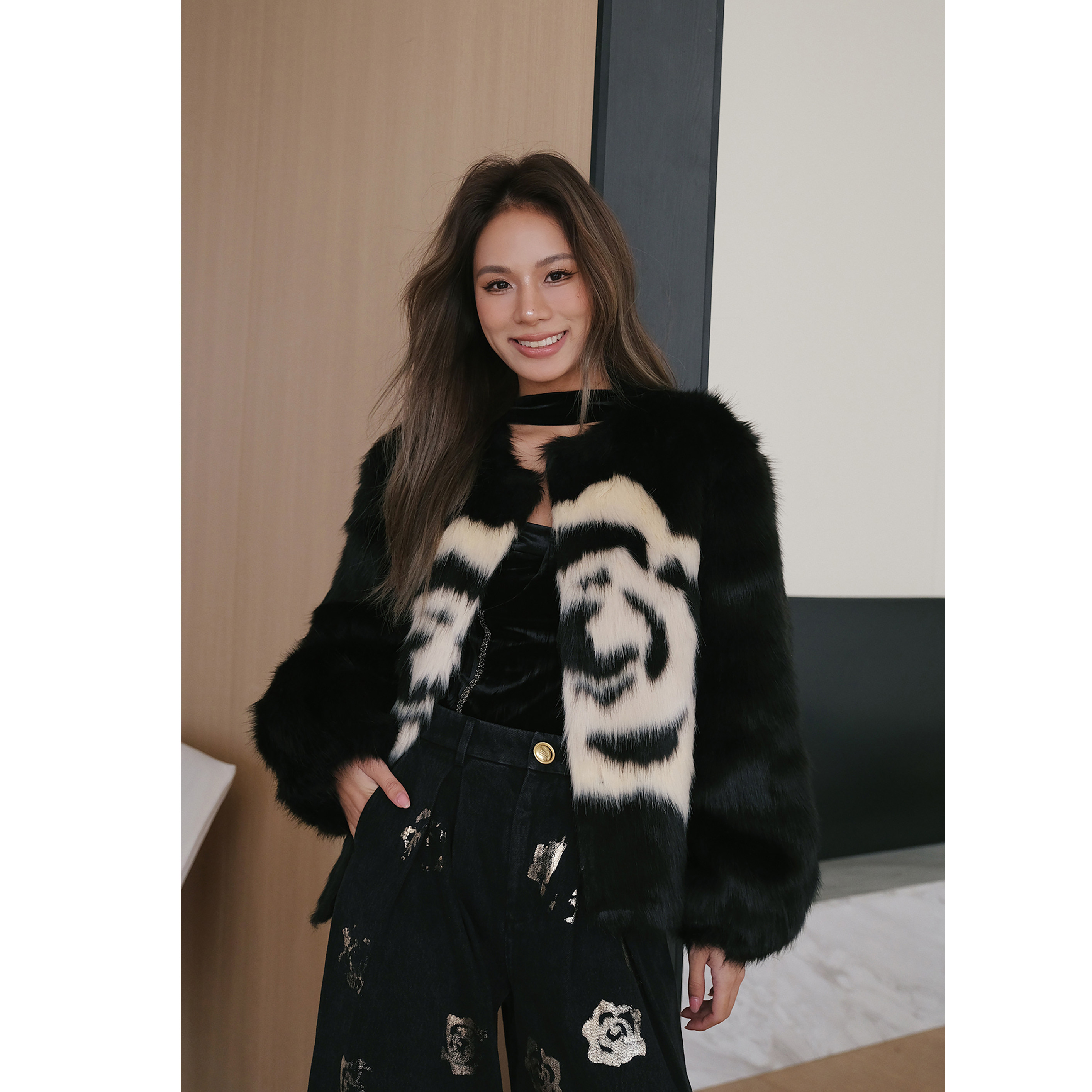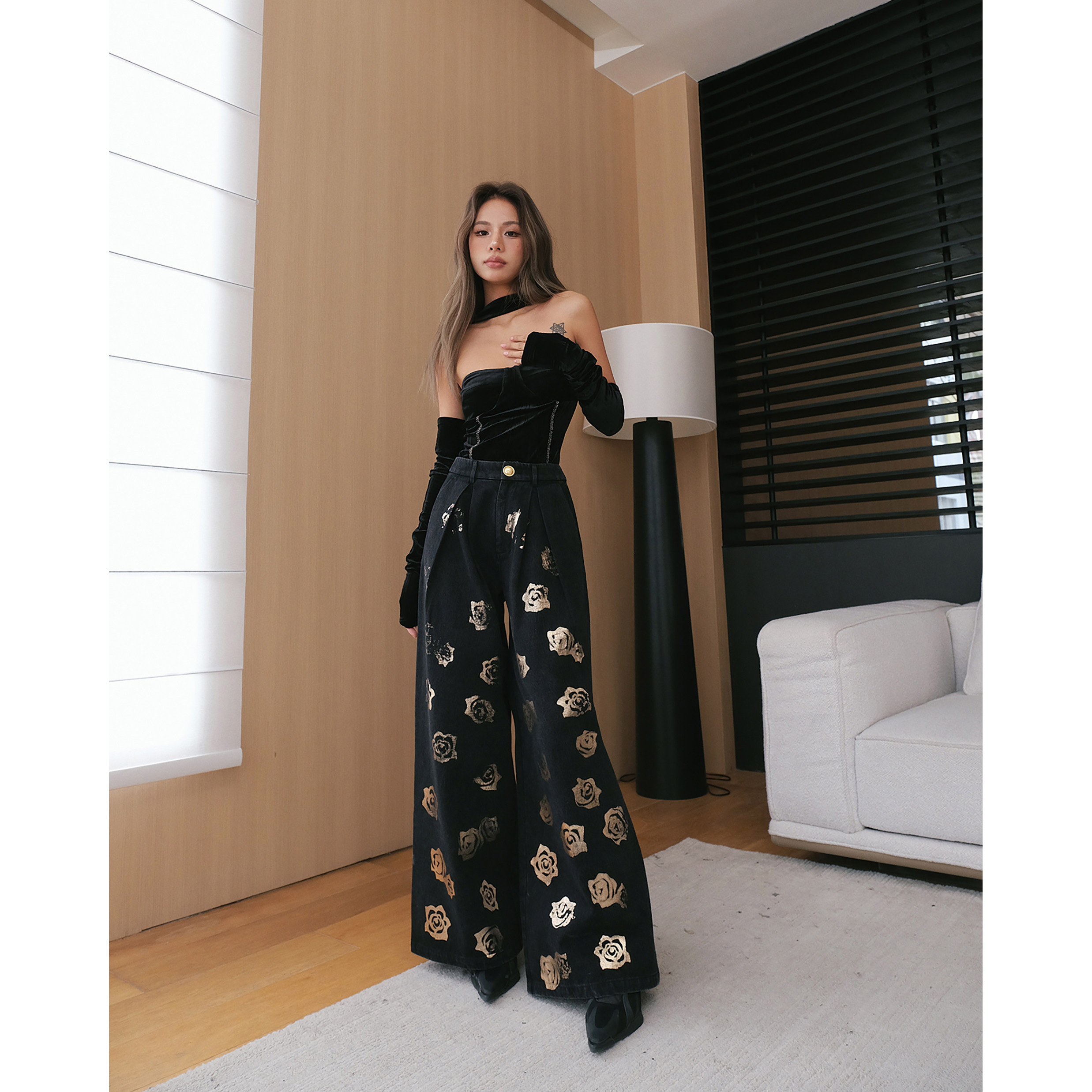 ROOM LUMING 秋冬丝绒挂脖连体上⾐烫⾦玫瑰印花⽜仔裤 清货折