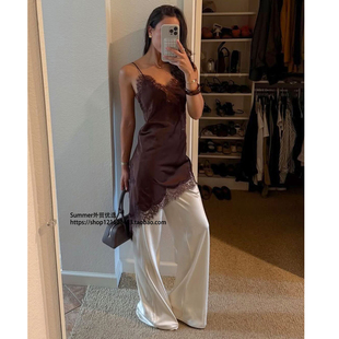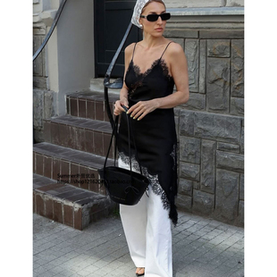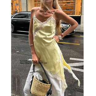 skirt camisole 蕾丝开叉吊带连衣裙色丁缎面开叉短裙Forged lace