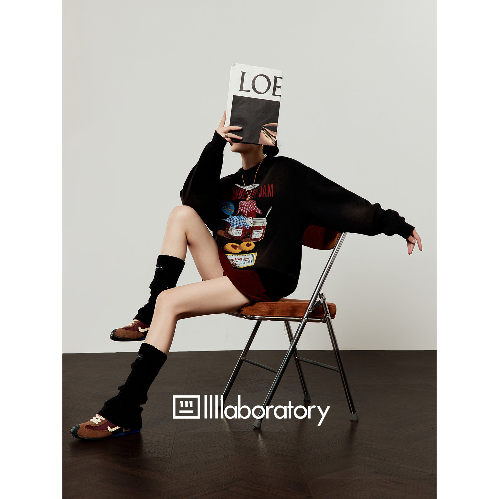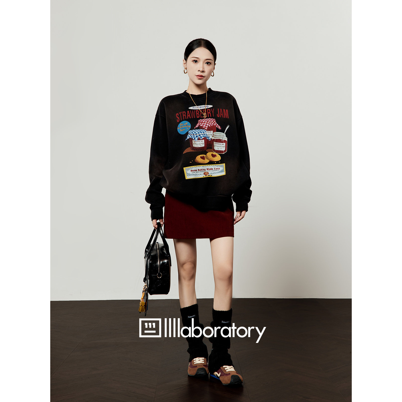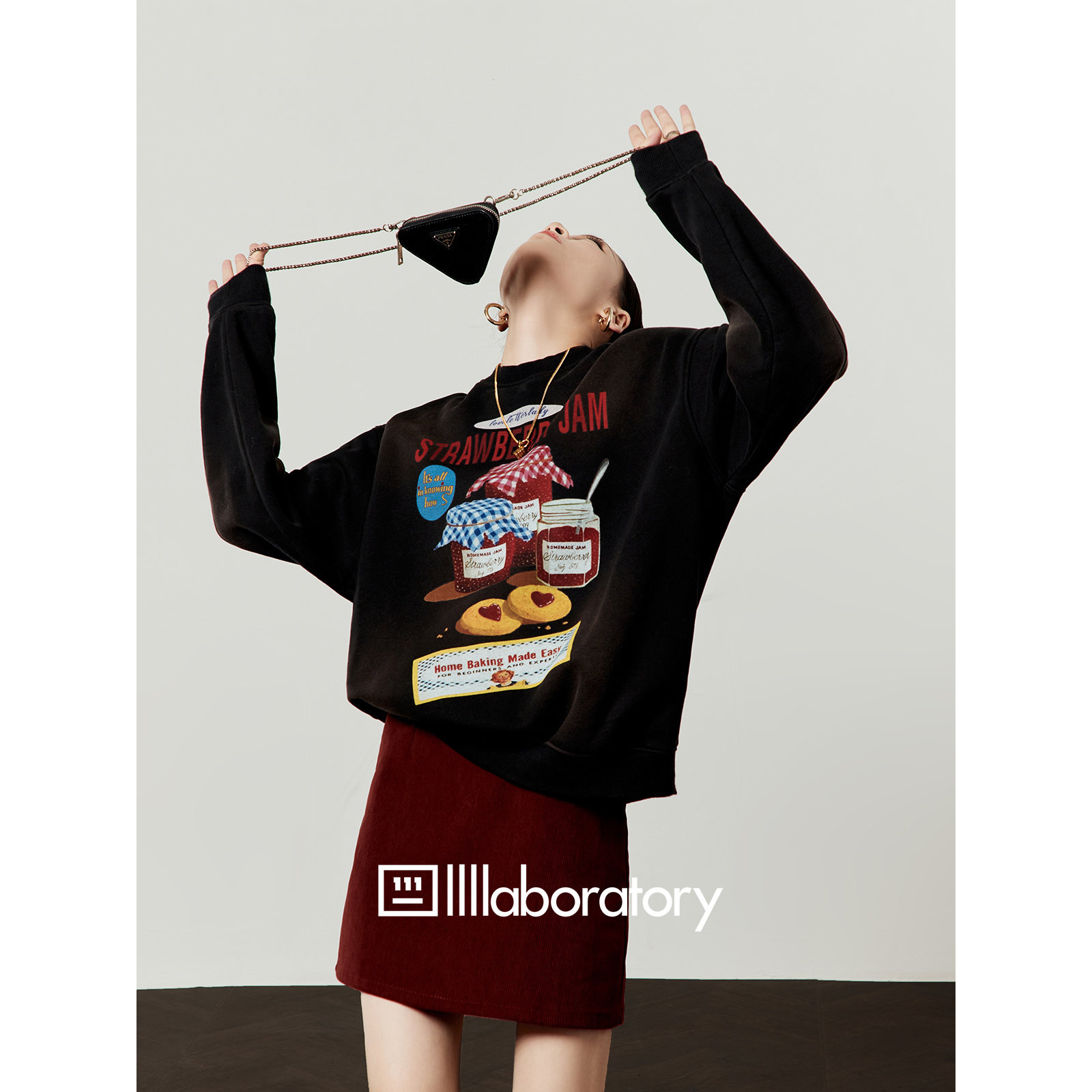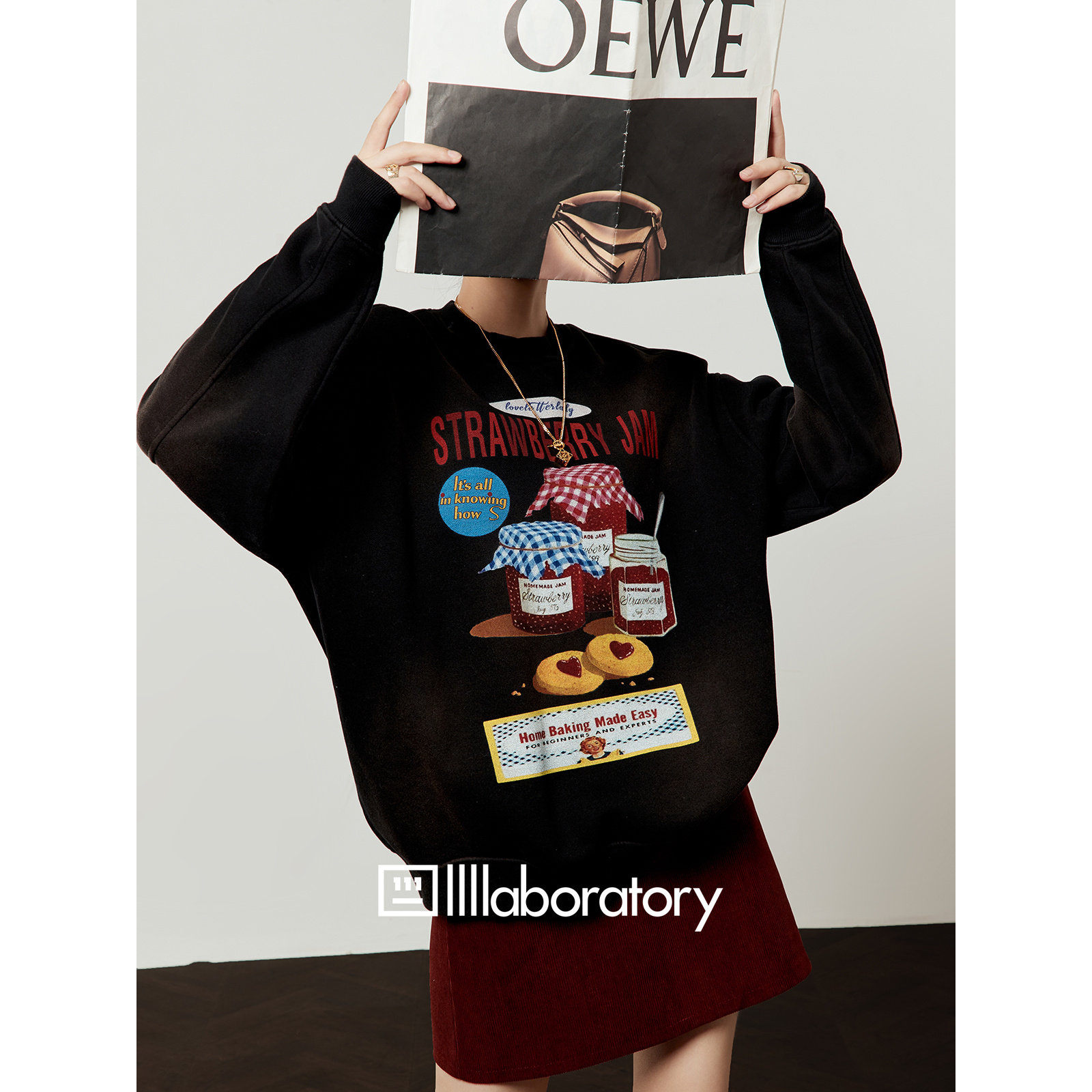 「周里物出品」复古黑卫衣女2025新款 草莓果酱印花设计感上衣 秋季