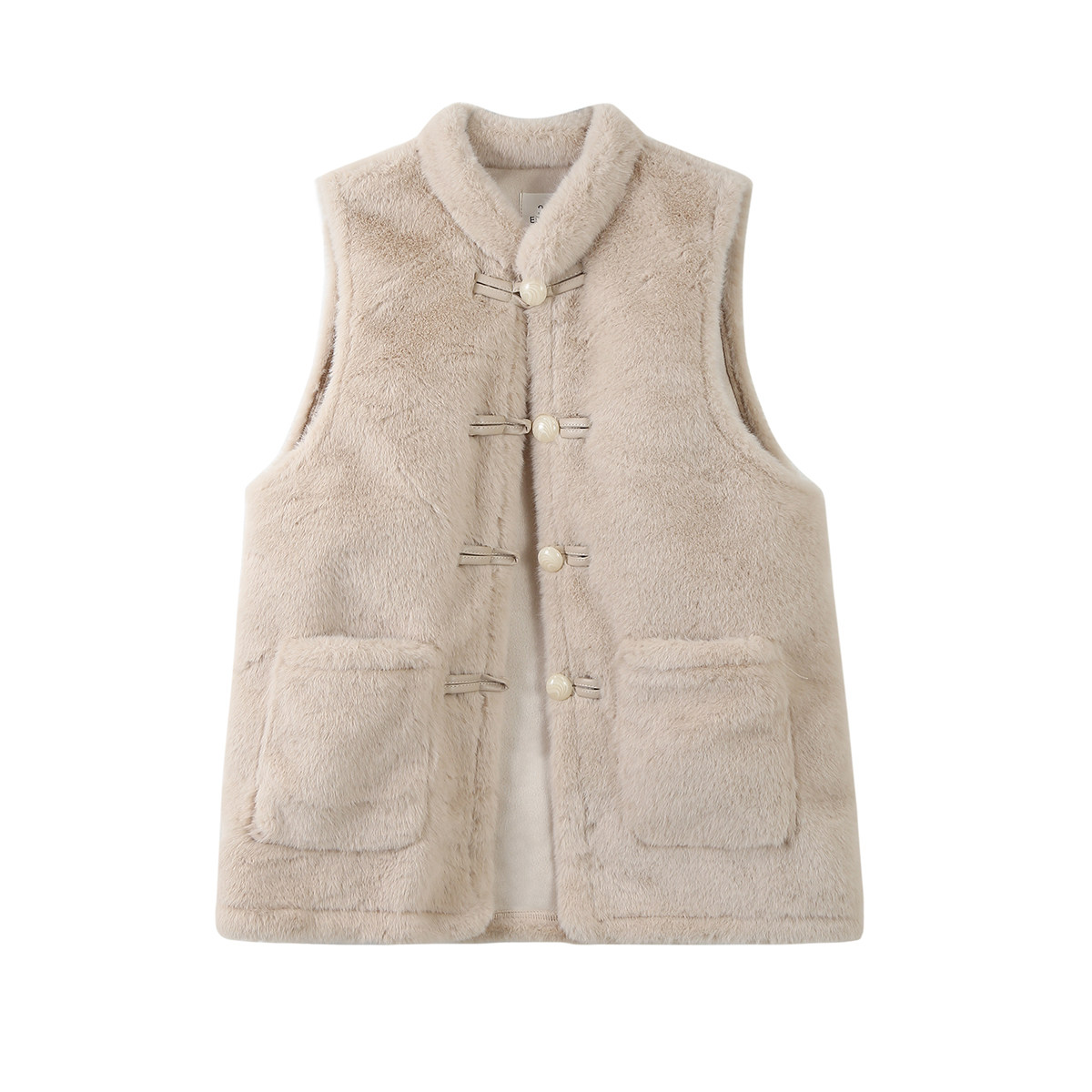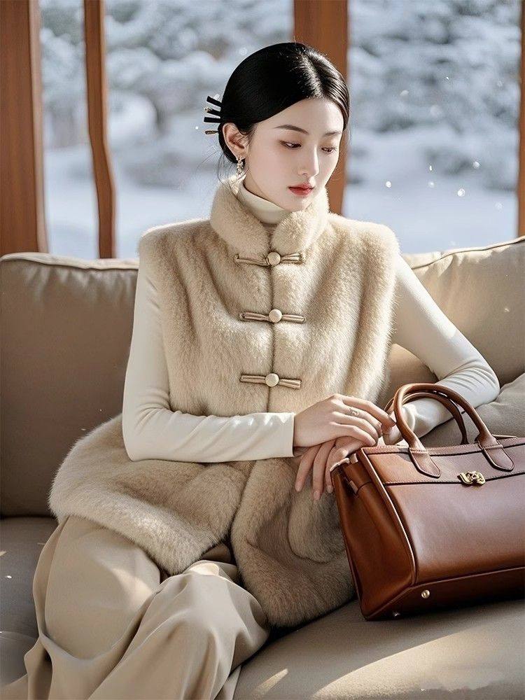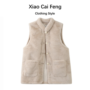 坎肩 杏色羊羔毛马甲背心保暖加厚国风盘扣立领2024冬季 新中式 女装