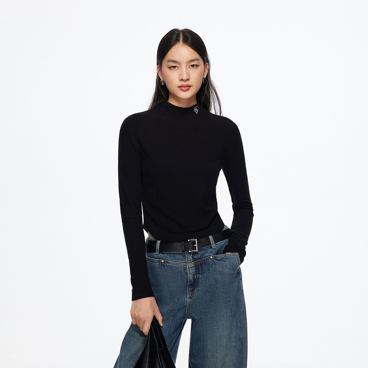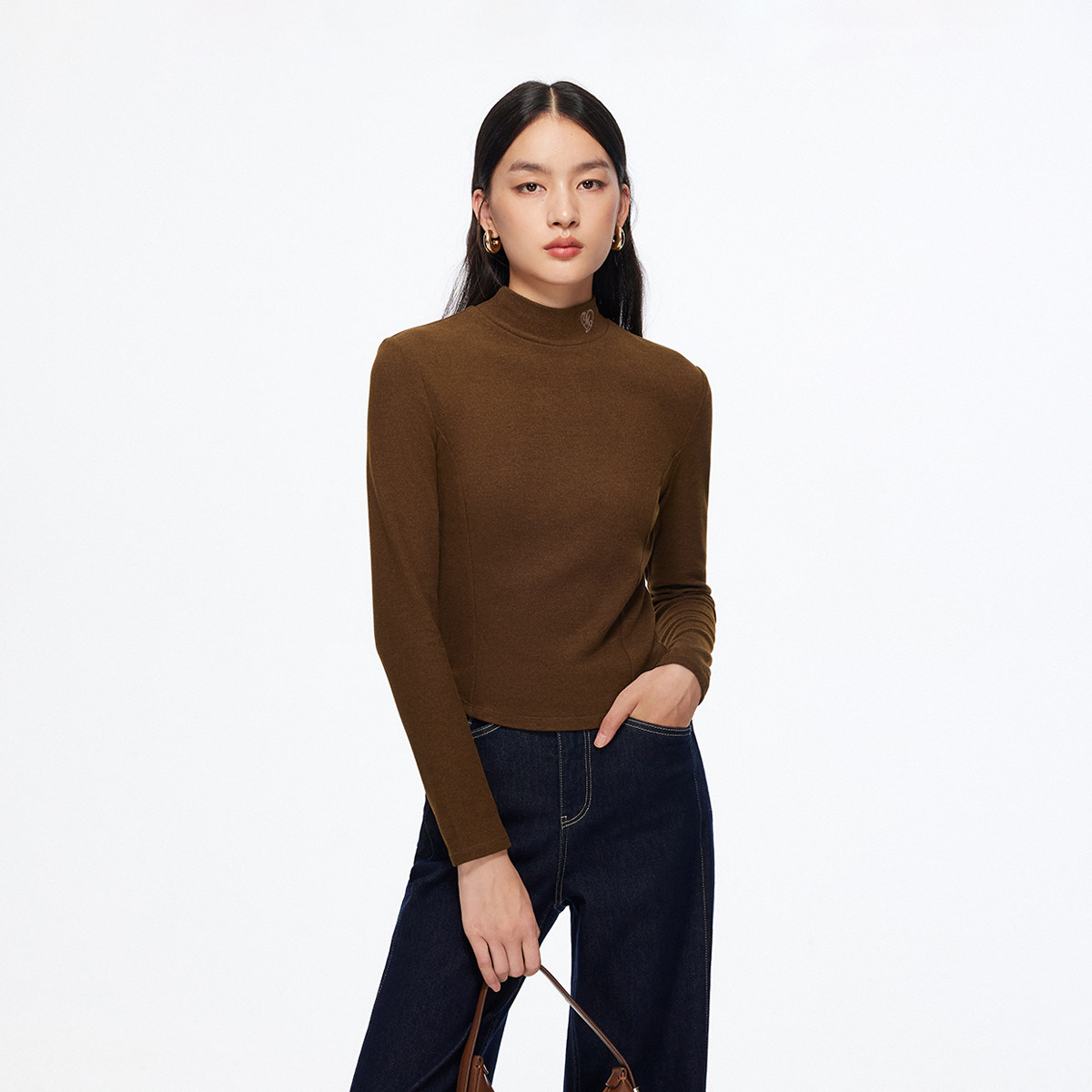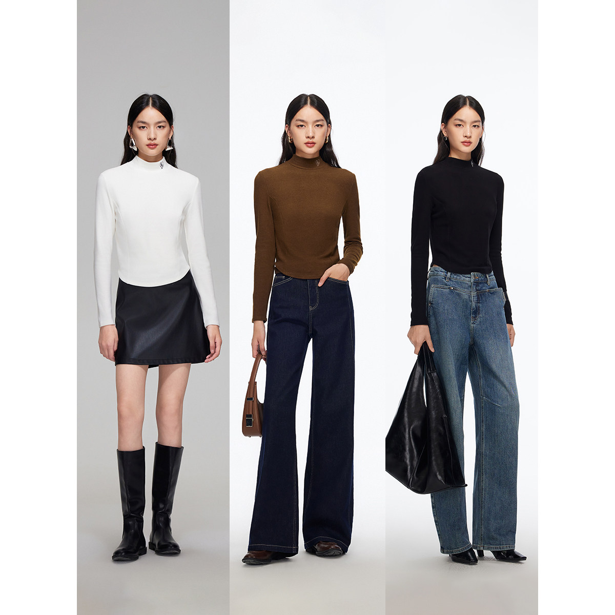 t恤衫 纯色棉白中领立领长袖 上衣 女春秋内搭2025新款 半高领打底衫