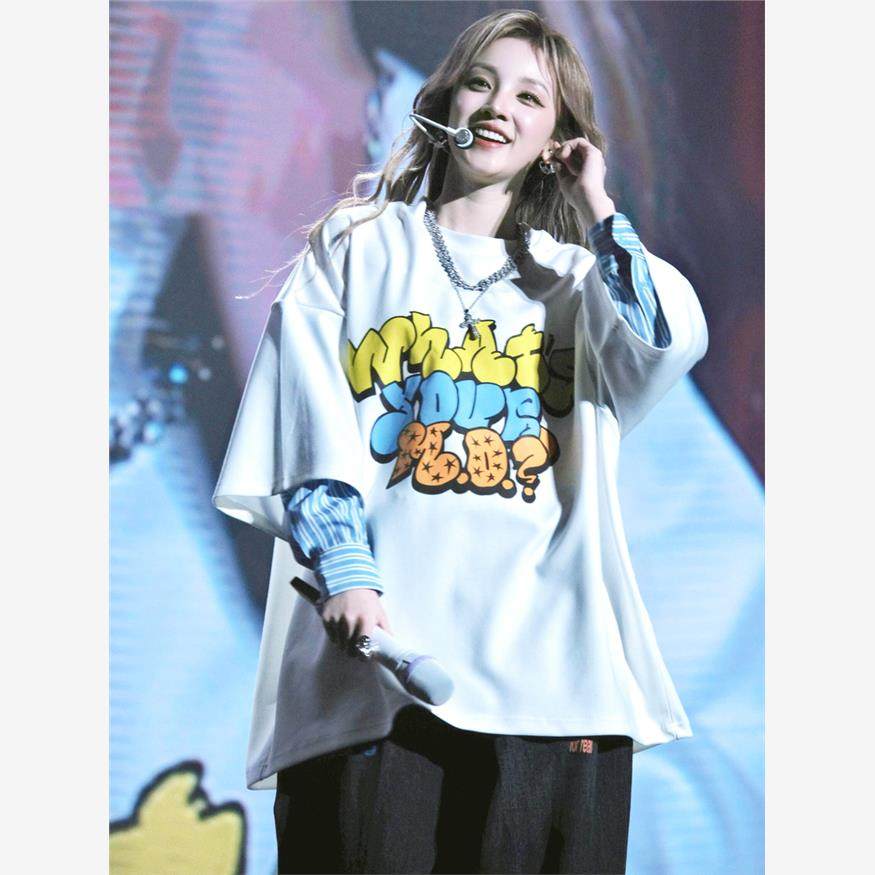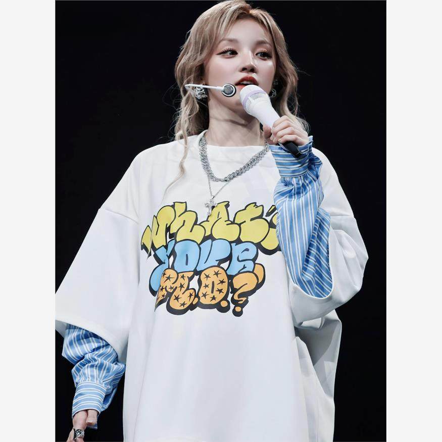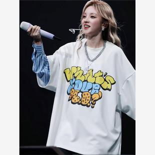 oversize白色假两件宽大上衣秋 T恤女2025新款 GIDLE宋雨琦同款 短袖