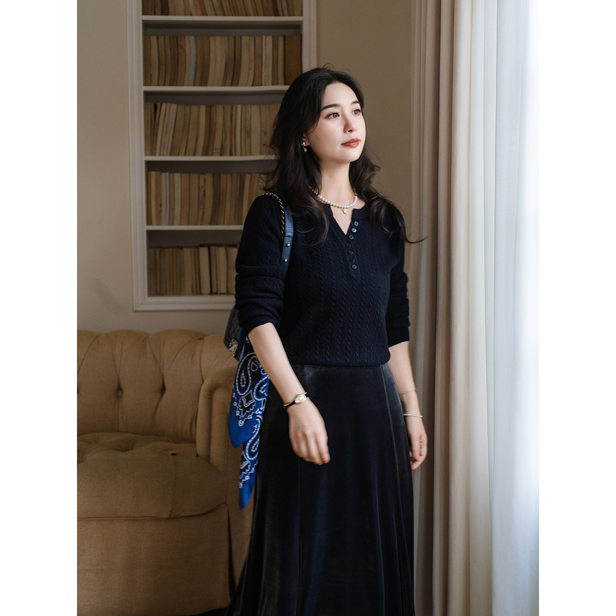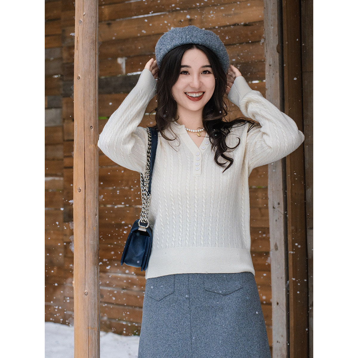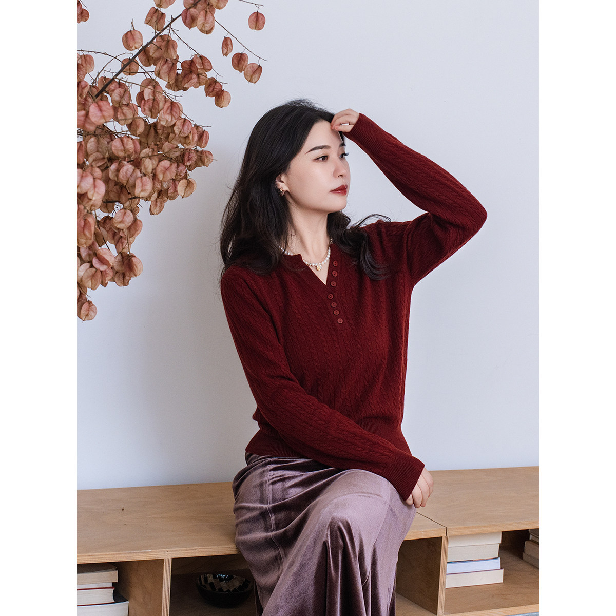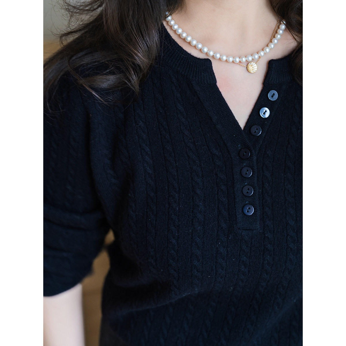 apipedream如一梦 编织记忆 绵羊毛绞花剪刀领亨利领针织套头衫