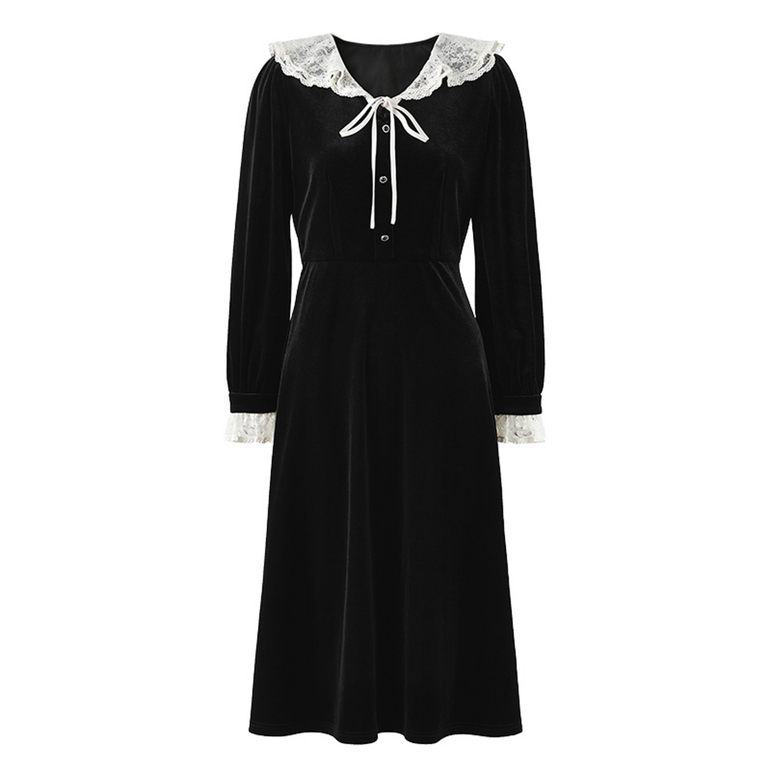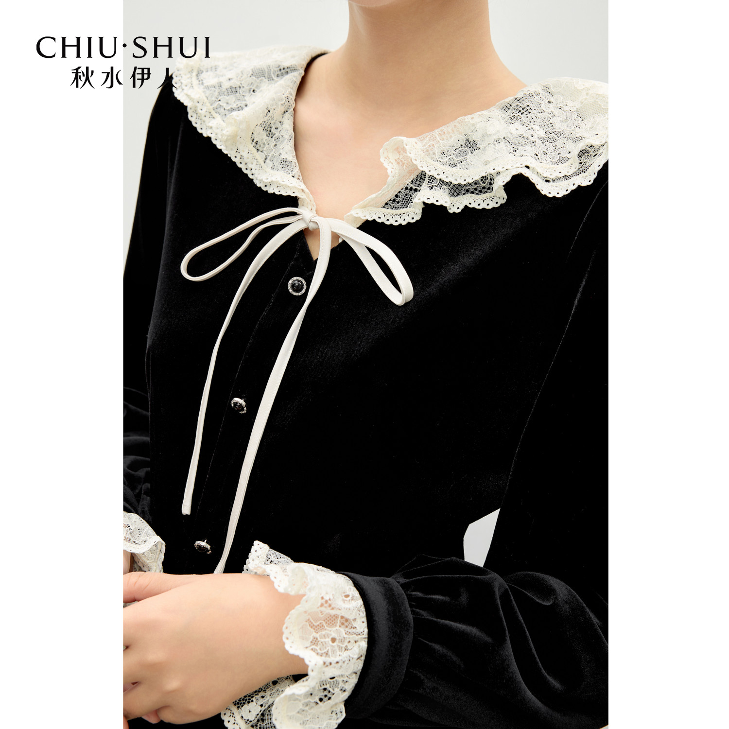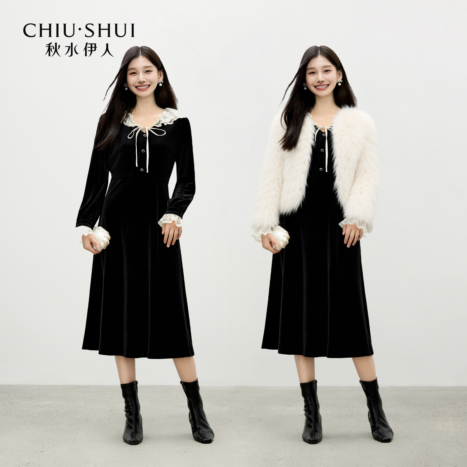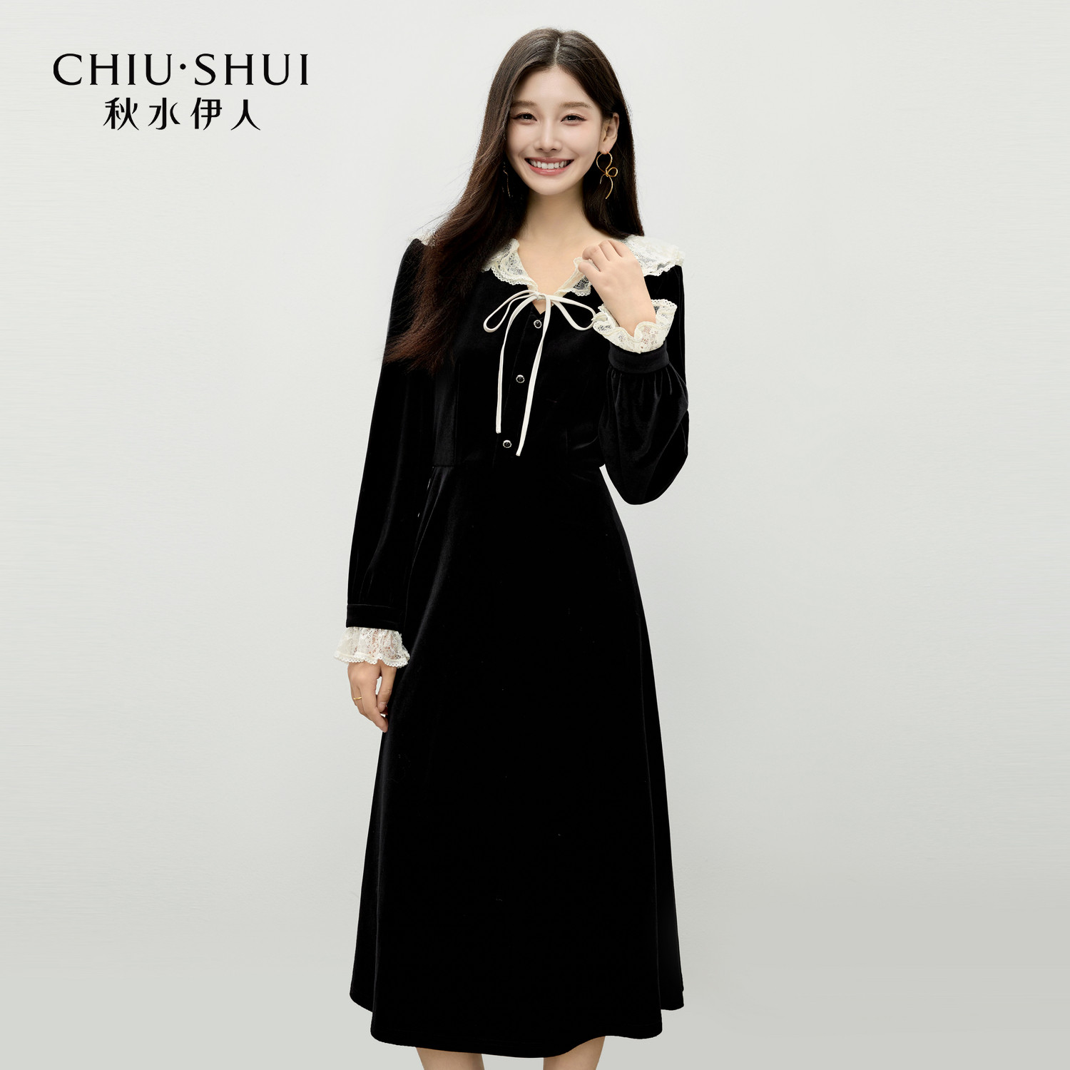 赫本风丝绒裙子 新款 秋水伊人法式 复古蕾丝花边连衣裙2025年冬季