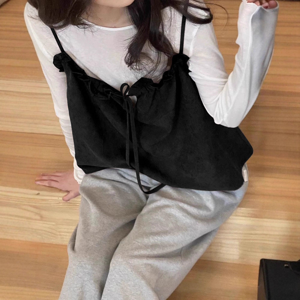ERUME现H25秋韩国东大门甜美纯色蝴蝶结可调节小花边叠穿吊带背心