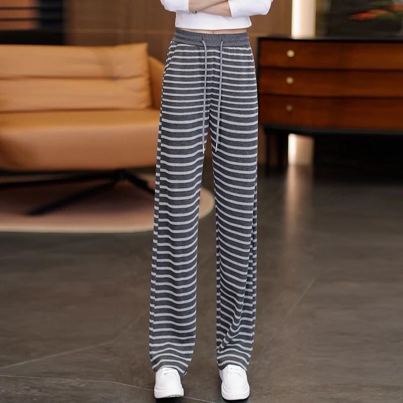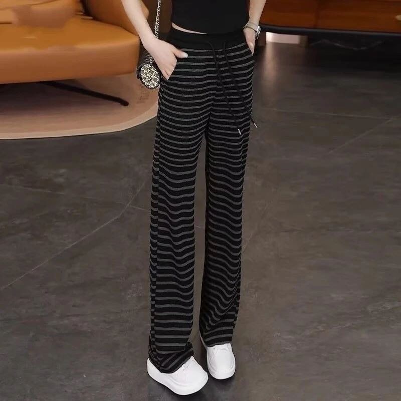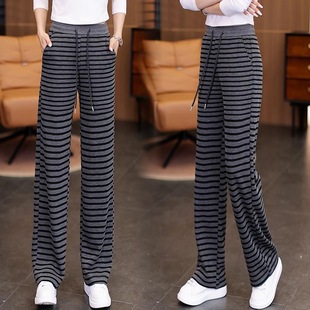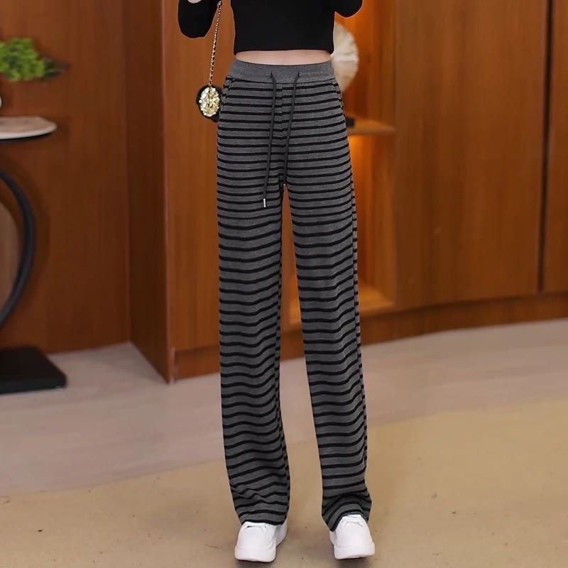 女休闲高腰宽松百搭慵懒风针织直筒裤 阔腿裤 条纹窄版 2025早秋新款