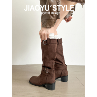 厚底骑士靴长靴高筒靴 高跟皮带扣粗跟长筒靴女2025新款 真皮 骄屿