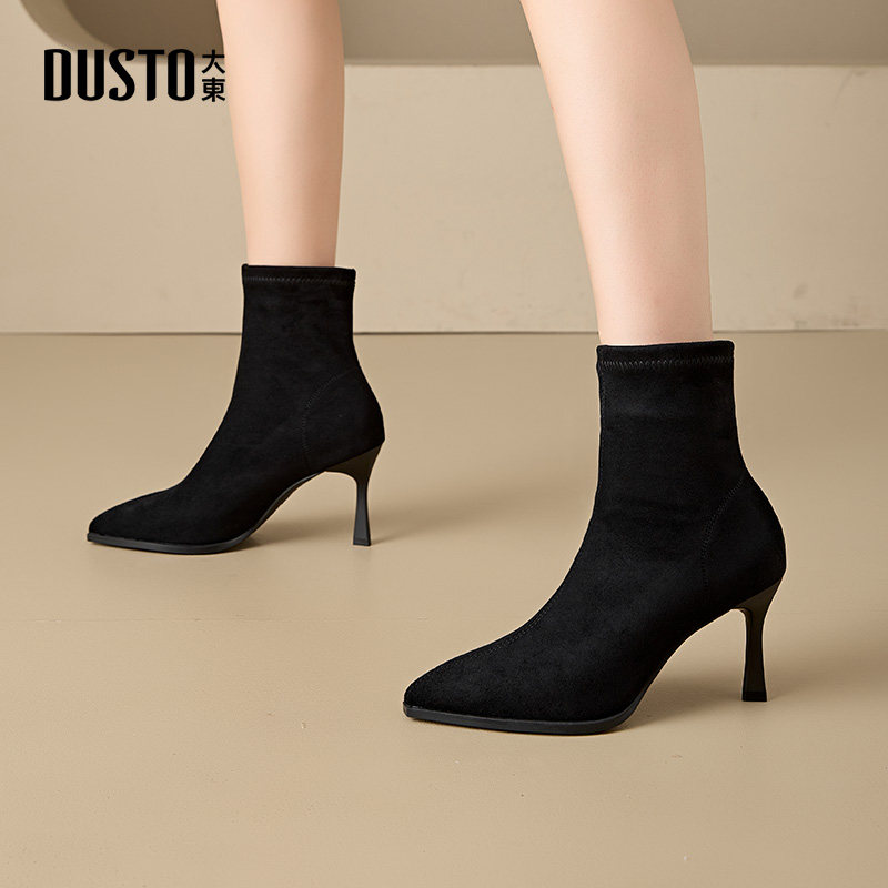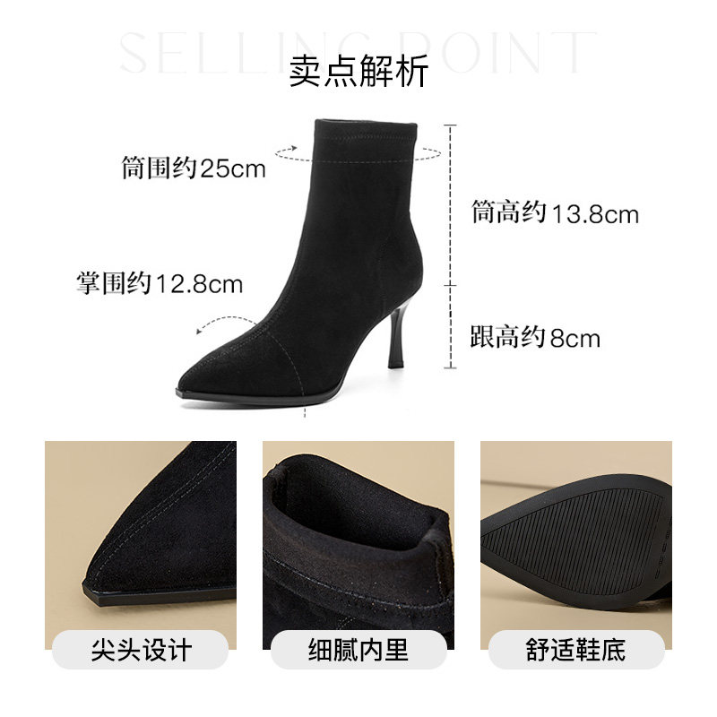 新款 靴2025冬季 绒面袜靴尖头细高跟加绒保暖女短靴子 时装 大东女鞋