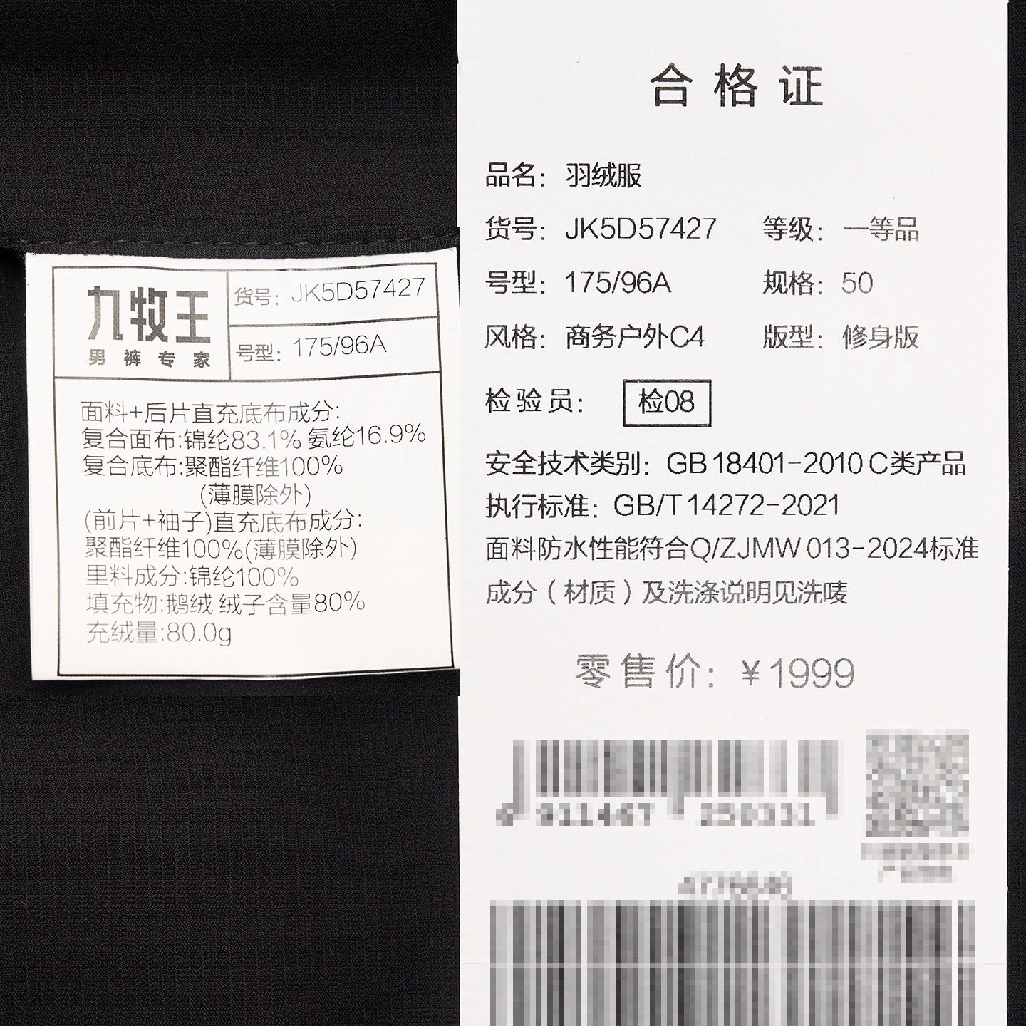 保暖男款 CJMJ排骨型羽绒服3拉链YKK连帽外套白鸭短款 新国标90