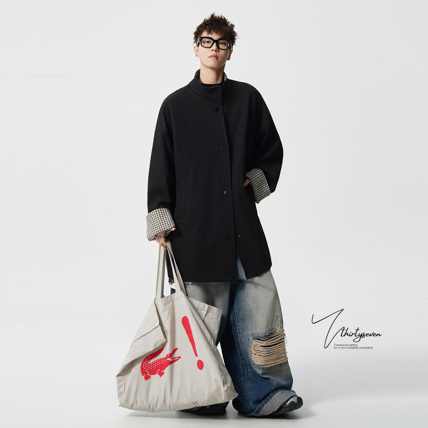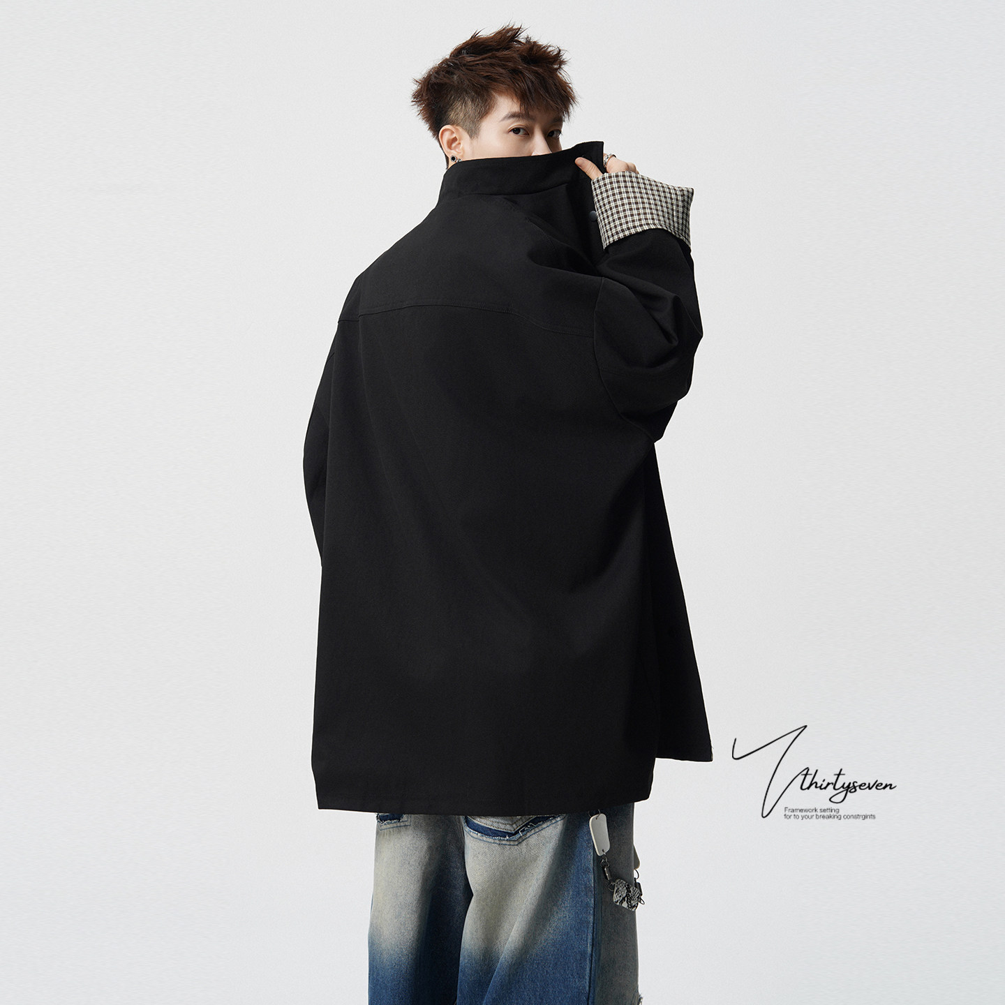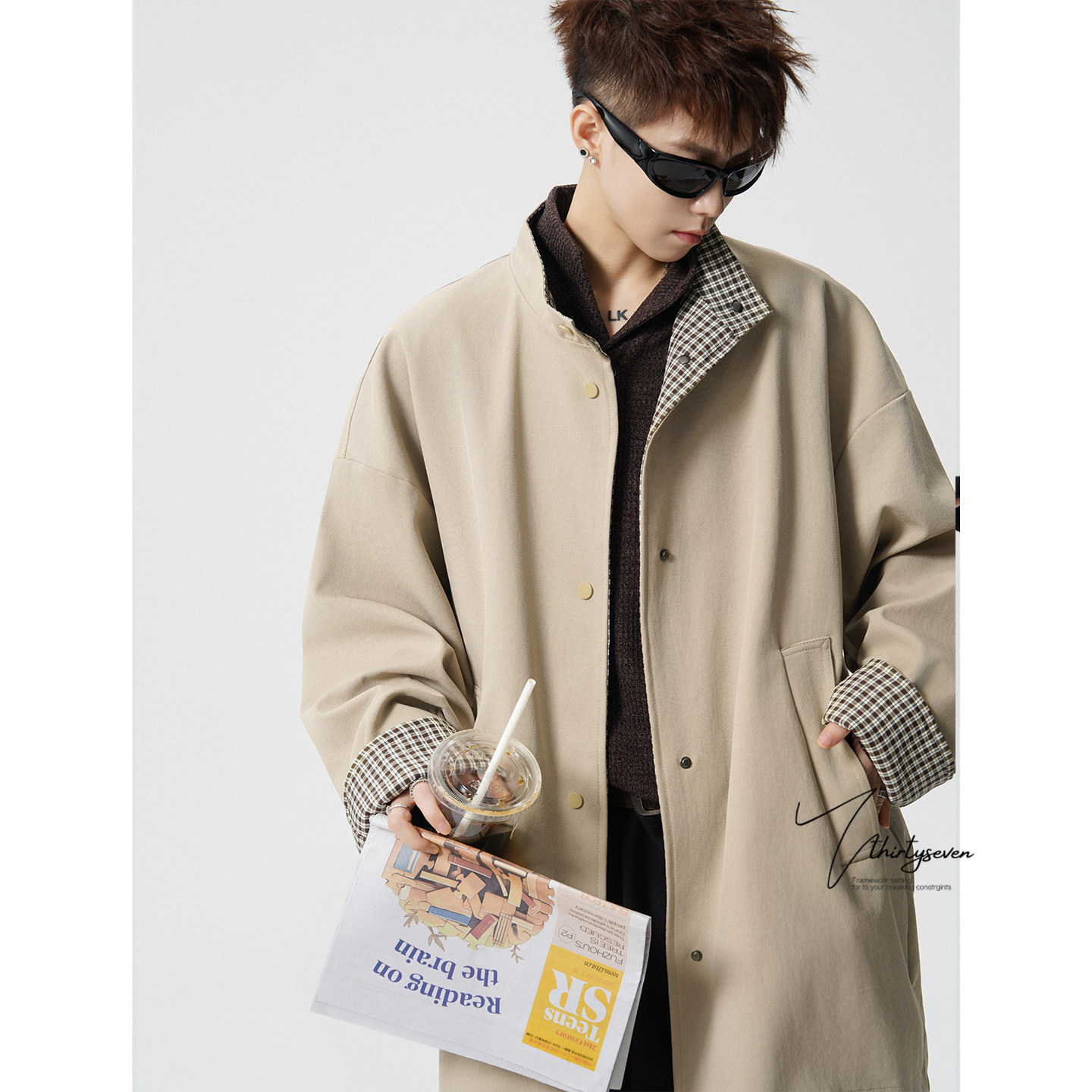 V37韩系氛围感卡其色立领风衣外套男春季 情侣披风 潮牌痞帅中长款