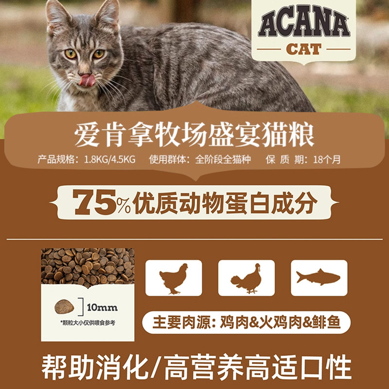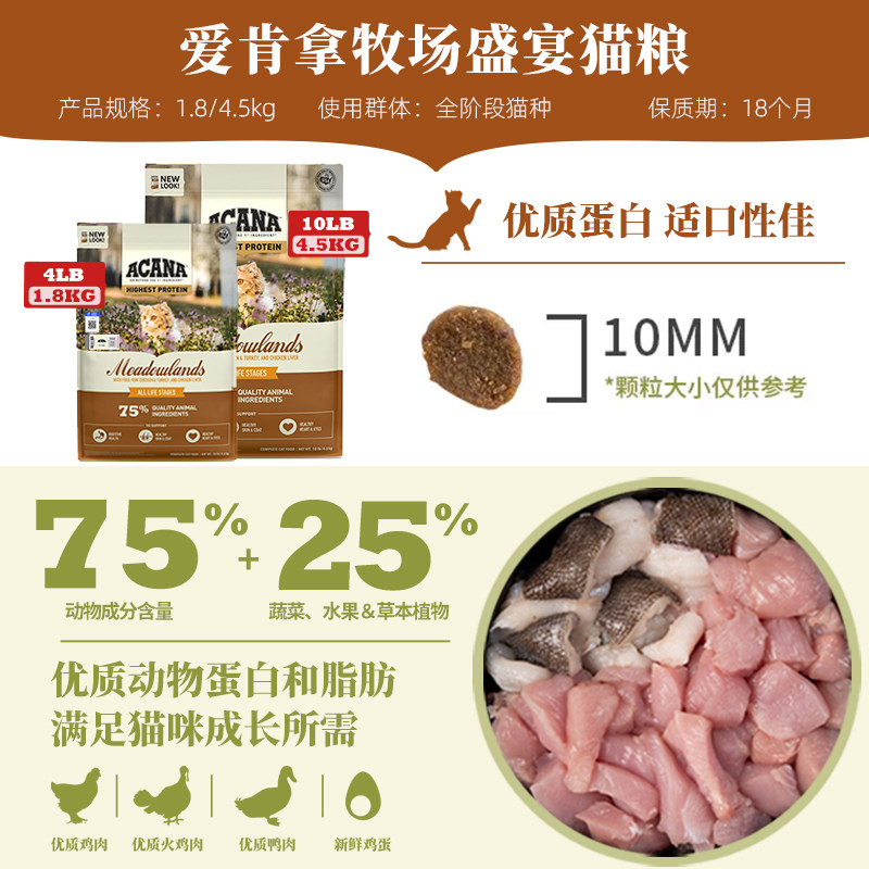 ACANA爱肯拿进口鸡肉猫粮成幼猫牧场盛宴猫粮4.5KG 百补