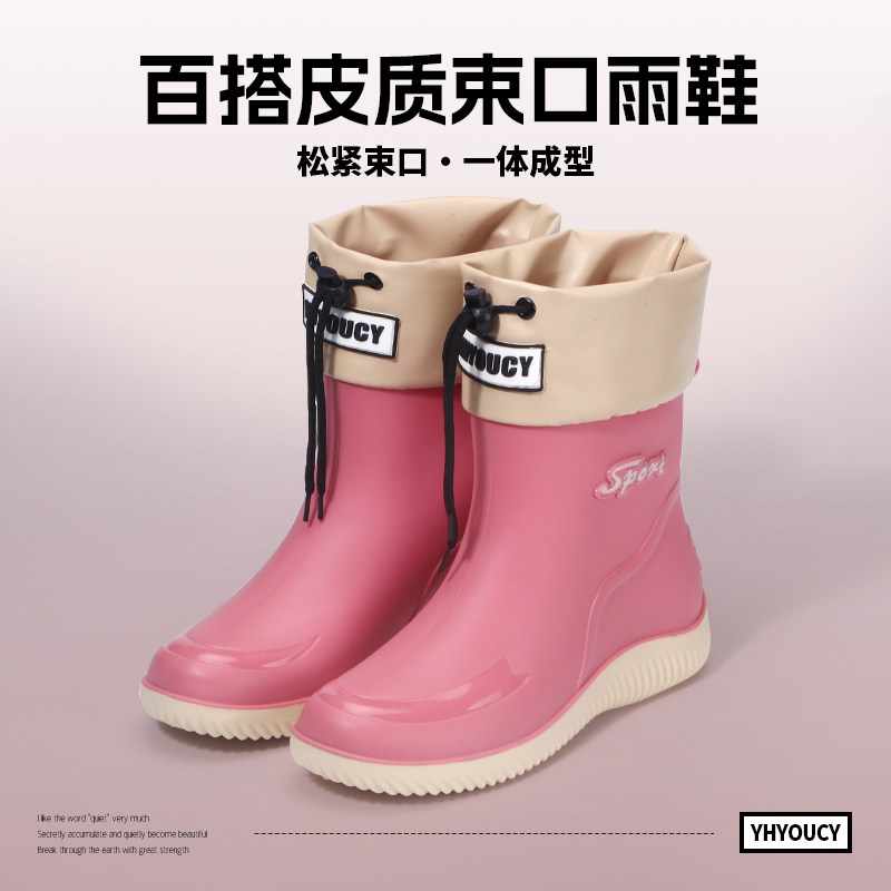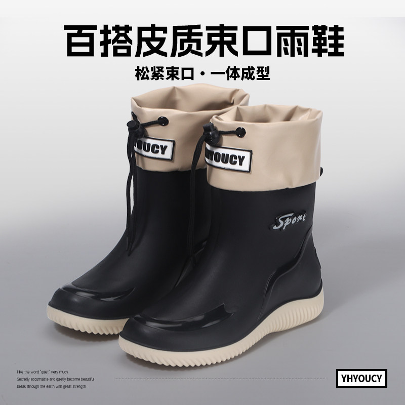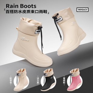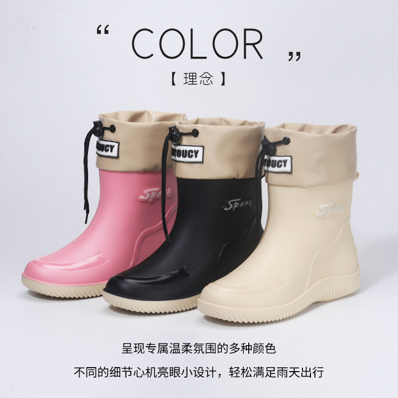 厨房保暖加绒工作雨靴 女短筒防水防滑松紧带户外胶鞋 时尚 束口雨鞋