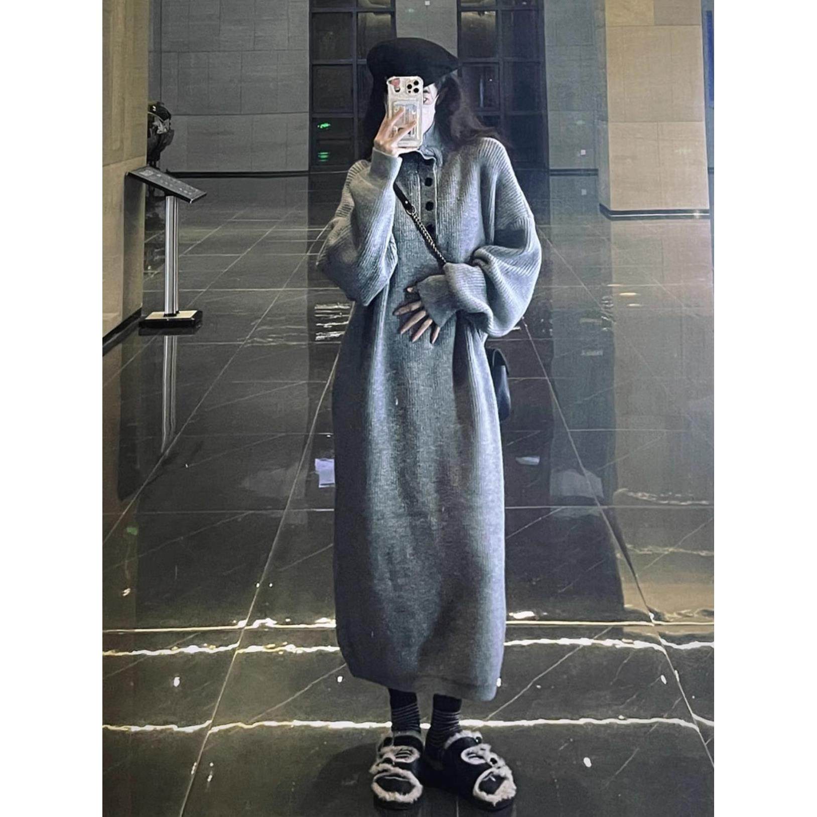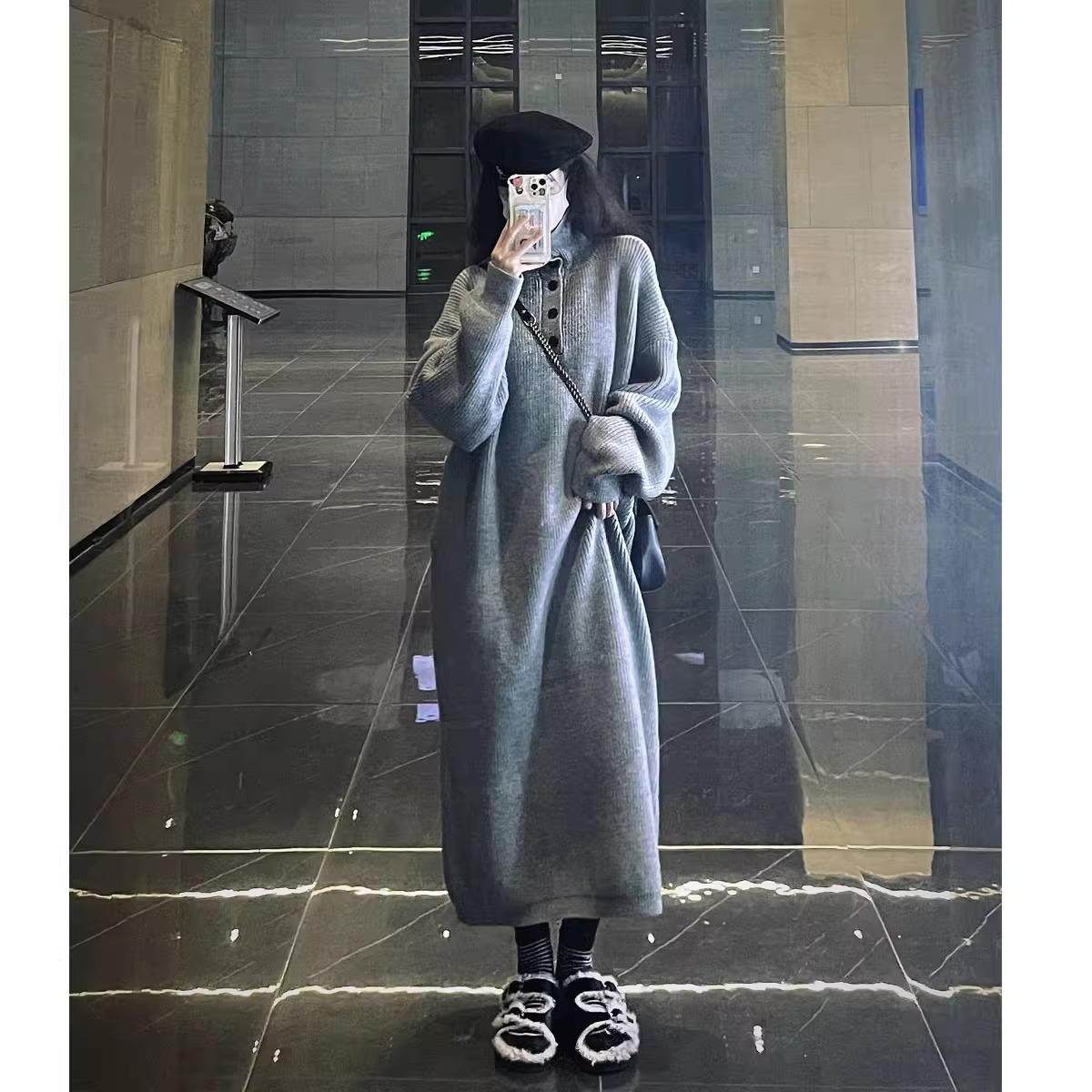 灰色慵懒风针织连衣裙女韩系大码 过膝毛衣裙子秋冬厚 宽松显瘦长款