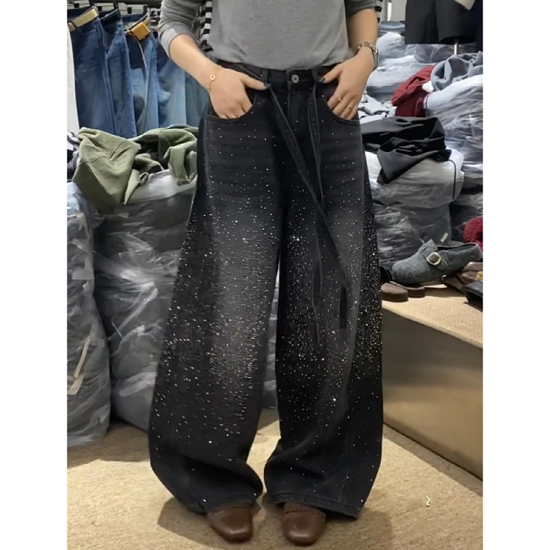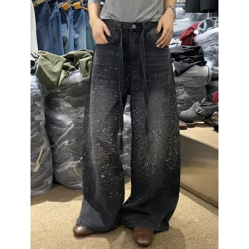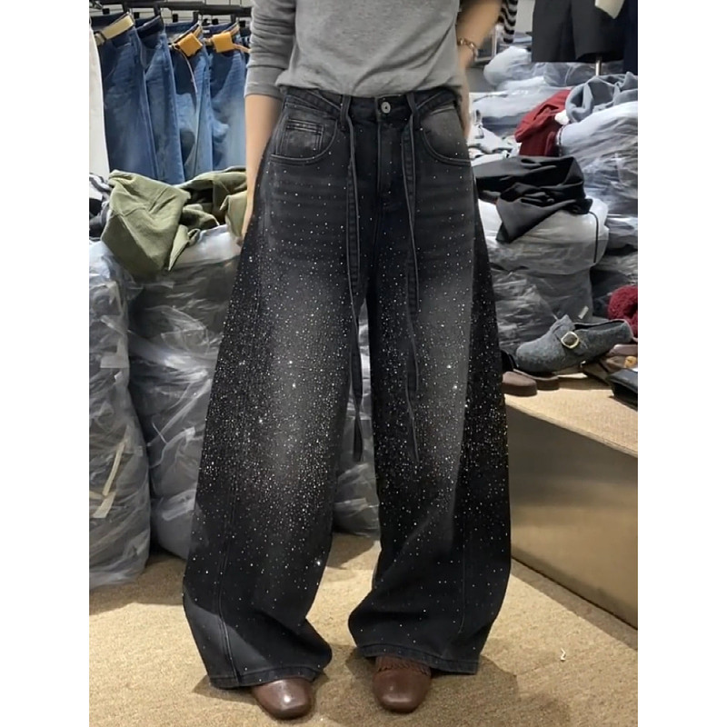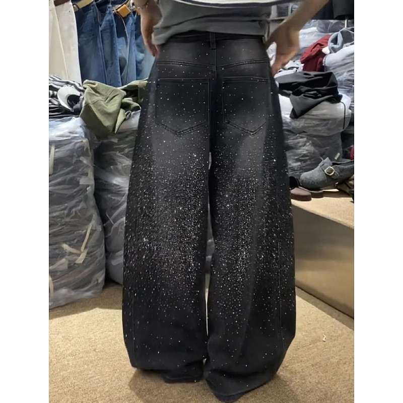 女2025秋冬宽松阔腿弯刀拖地裤 复古重工满天星烫钻牛仔裤 美式 大码