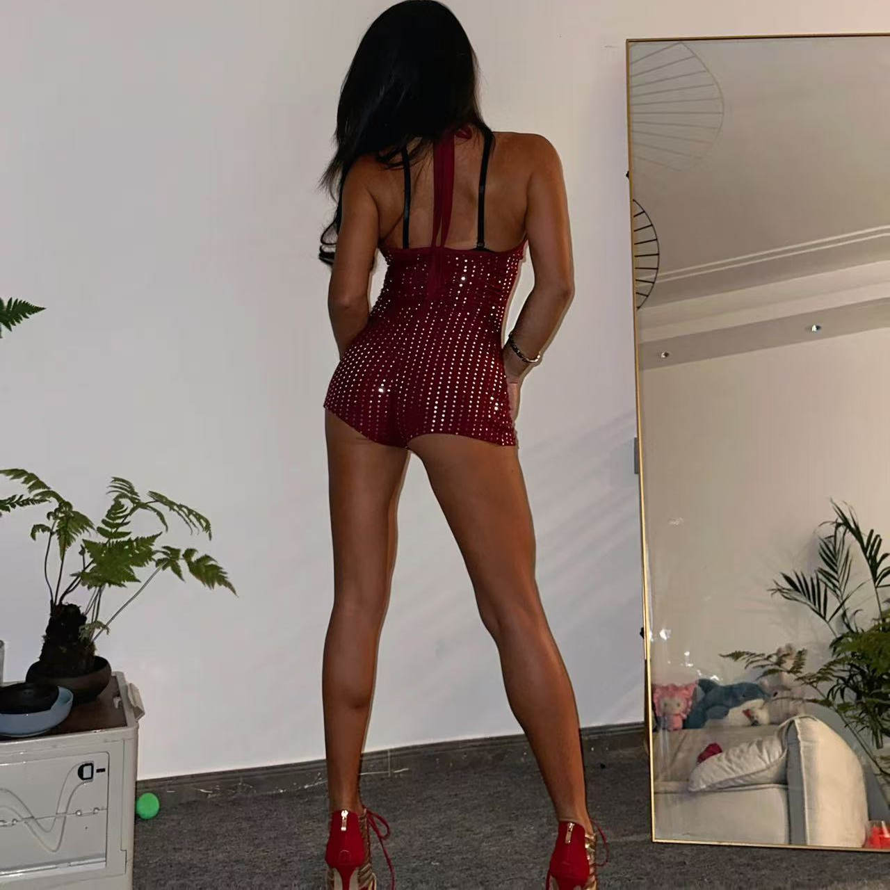 1996heels女王舞蹈室练习服深V性感连体衣大露背显瘦贴钻细闪短裤