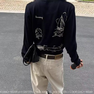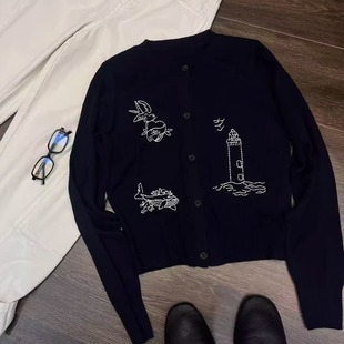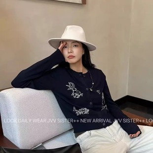 JVVSISTER秋冬大牌风刺绣针织毛线开衫 女显瘦百搭藏蓝色圆领外套