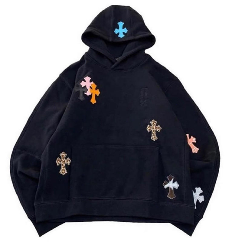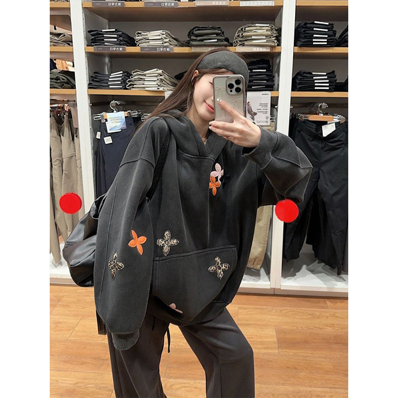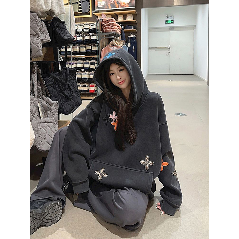 宽松套头上衣 复古贴皮刺绣连帽卫衣男女秋冬设计感个性 大码 美式