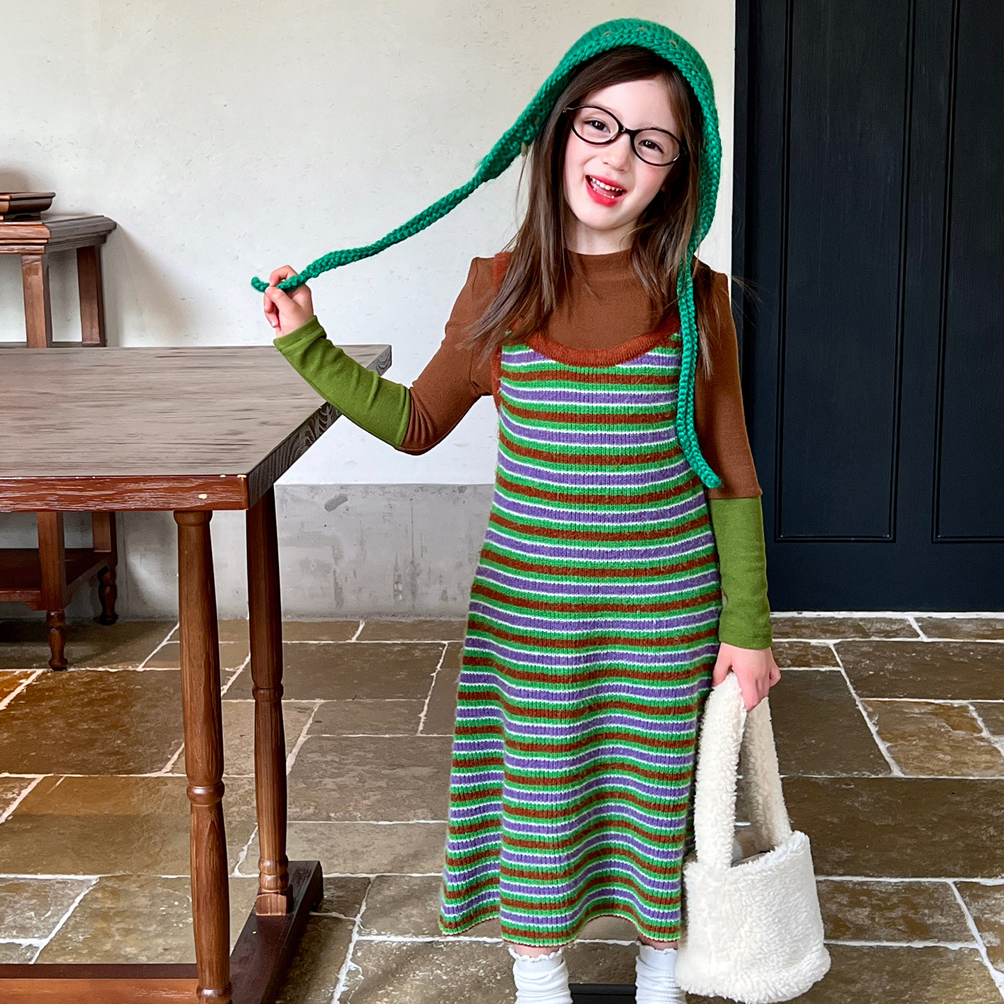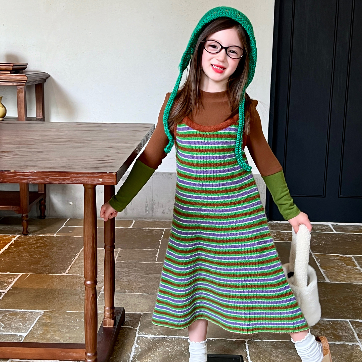 女宽松长裙子 新款 阔色条纹假两件背心裙长袖 针织连衣裙2025秋冬季