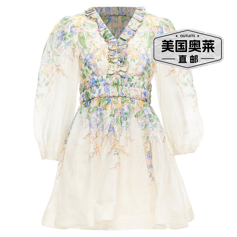美国奥莱直 粉红色 自营 Zimmermann花园花卉亚麻补丁腰带连衣裙