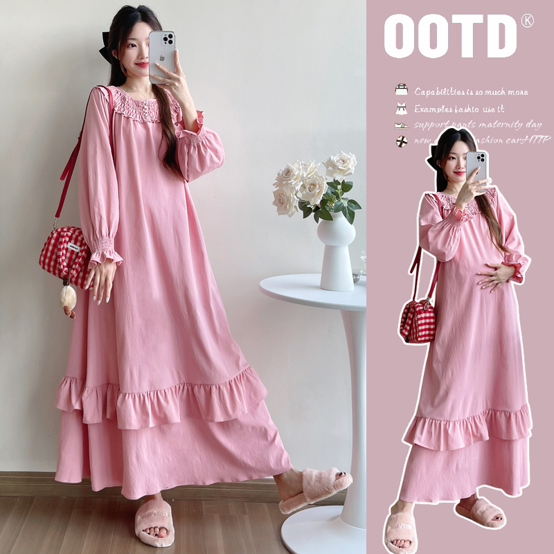 孕妇裙子秋装 显瘦连衣裙 荷叶边圆领甜美淑女宽松型过膝潮妈裙秋季