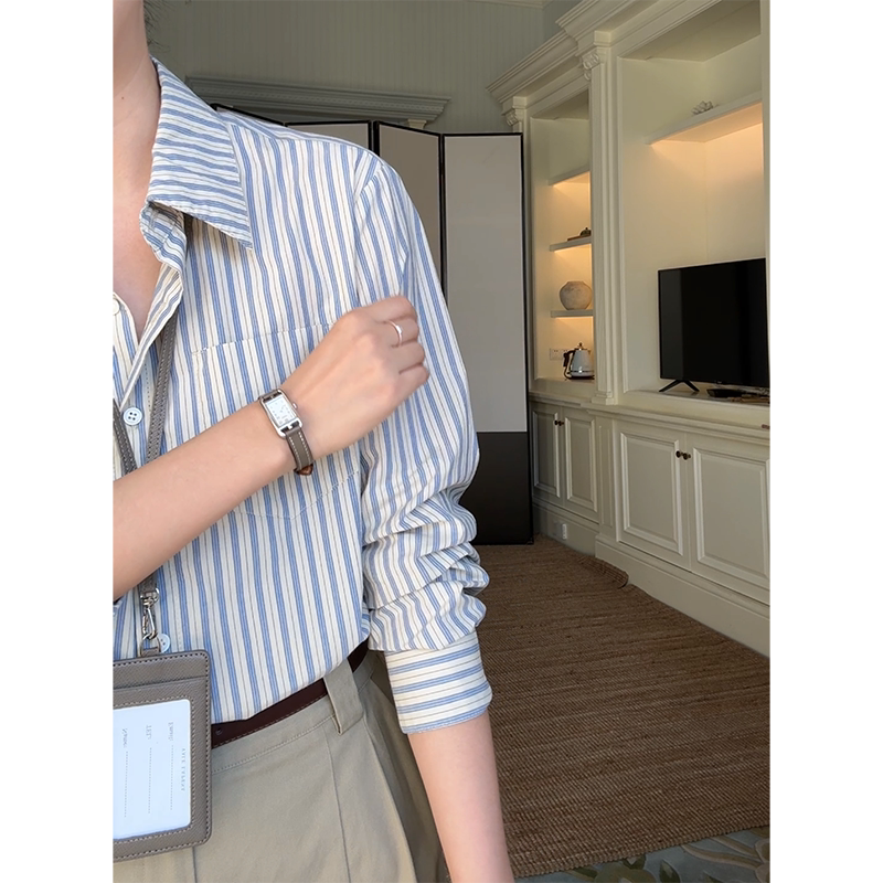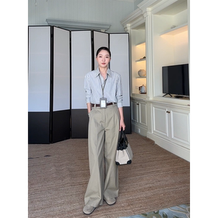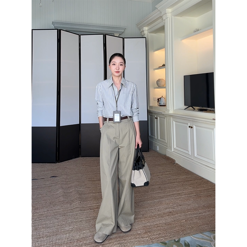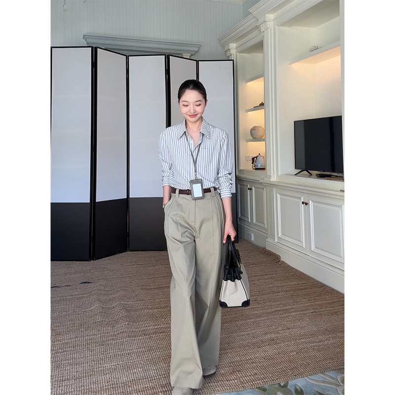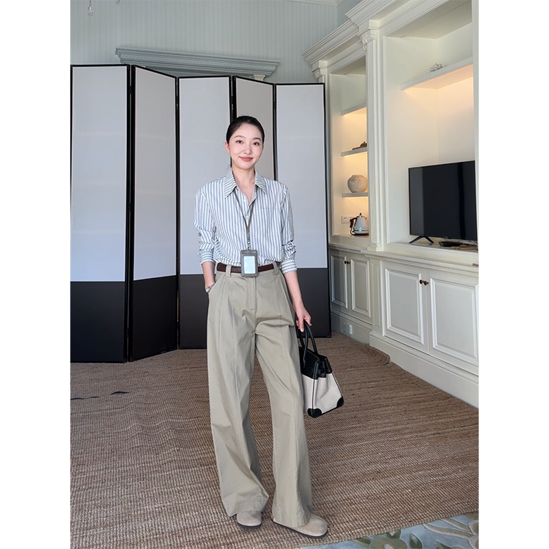 女 早秋上衣直筒阔腿长裤 郭九九呢 100%棉简约休闲显瘦条纹衬衫