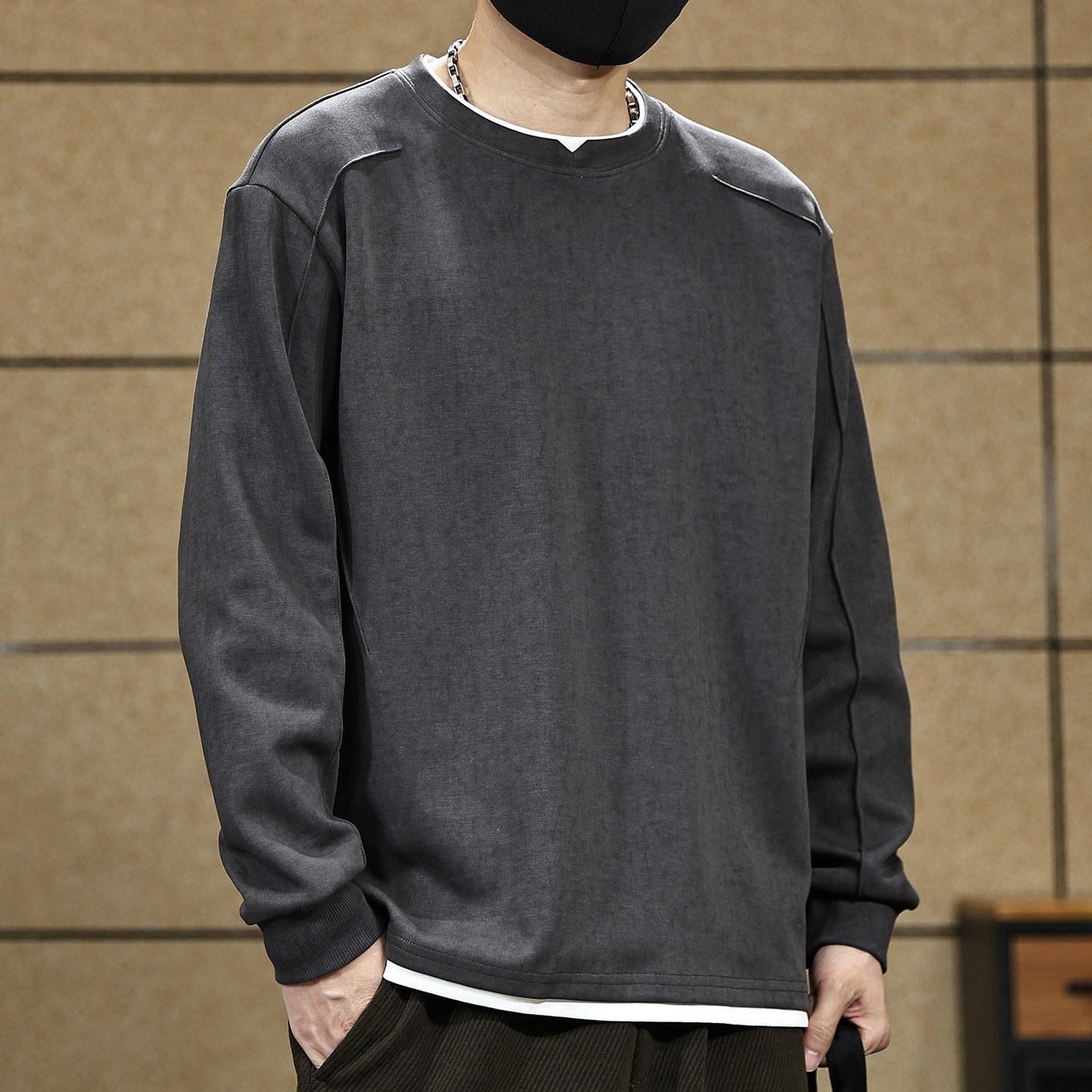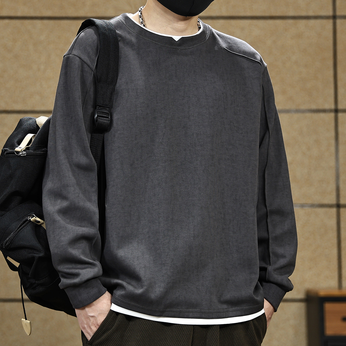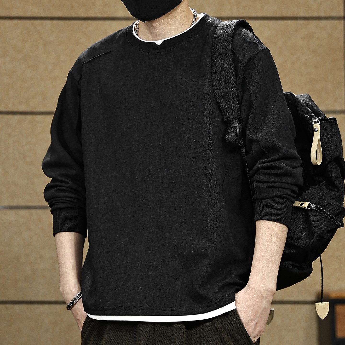 宽松水洗印花圆领卫衣潮牌叠穿打底衫 卫衣男秋冬款 假两件长袖 美式