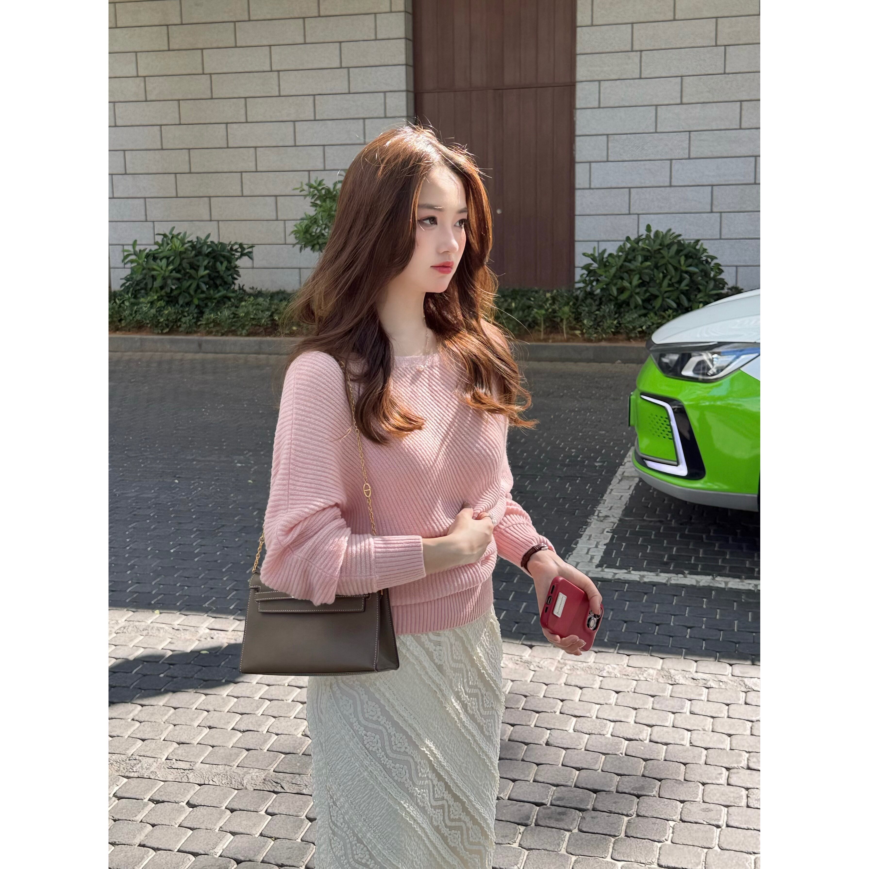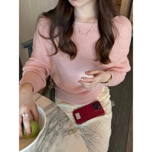 不对称针织衫 绵羊毛山羊绒2026春一字领蝙蝠袖 首尔樱花 张羞羞
