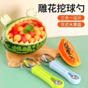 不锈钢三合一水果分割器家用多功能挖球器挖球勺水果取肉雕花工具
