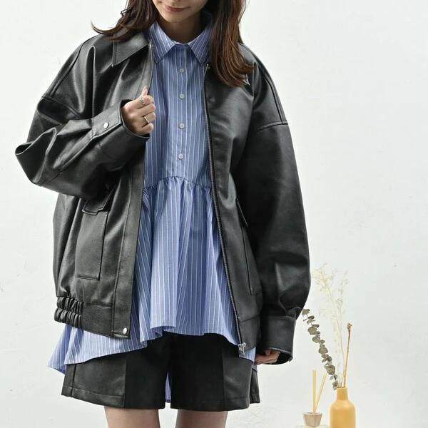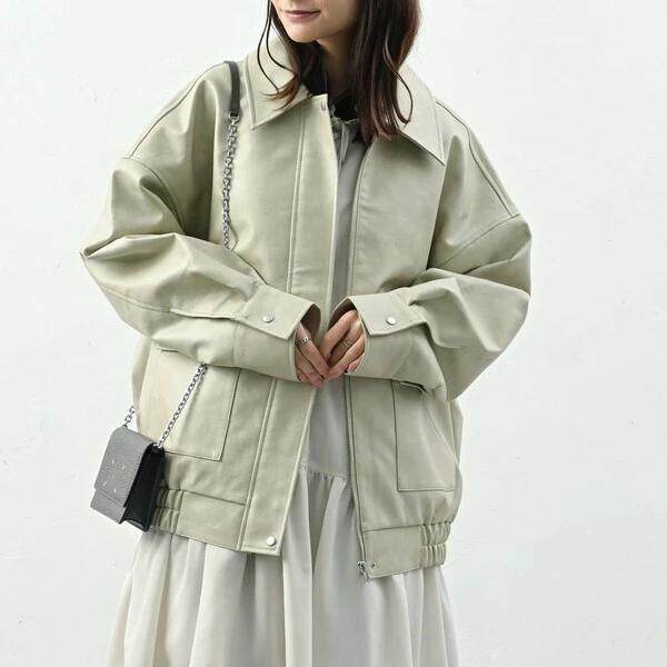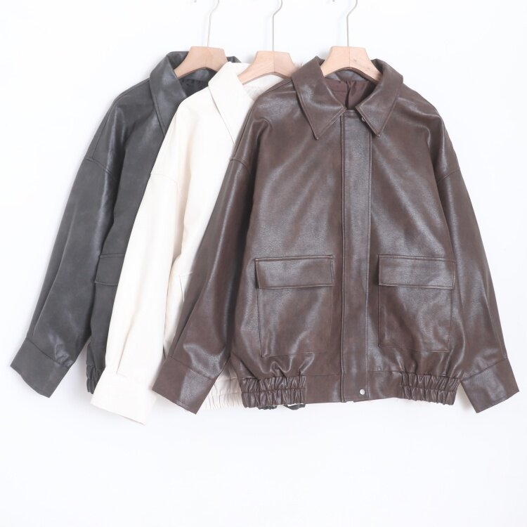 D15079日单新款 客供料拉链翻边领宽松女纯通勤气质休闲PU皮衣外套