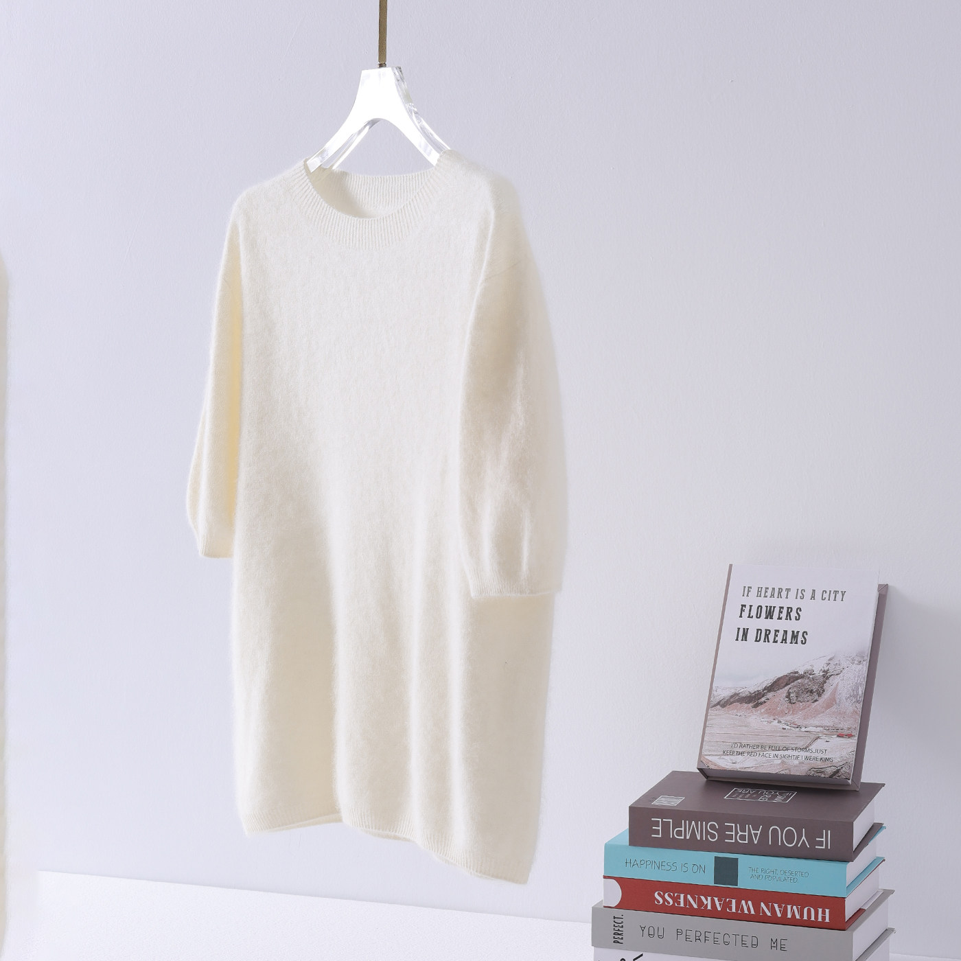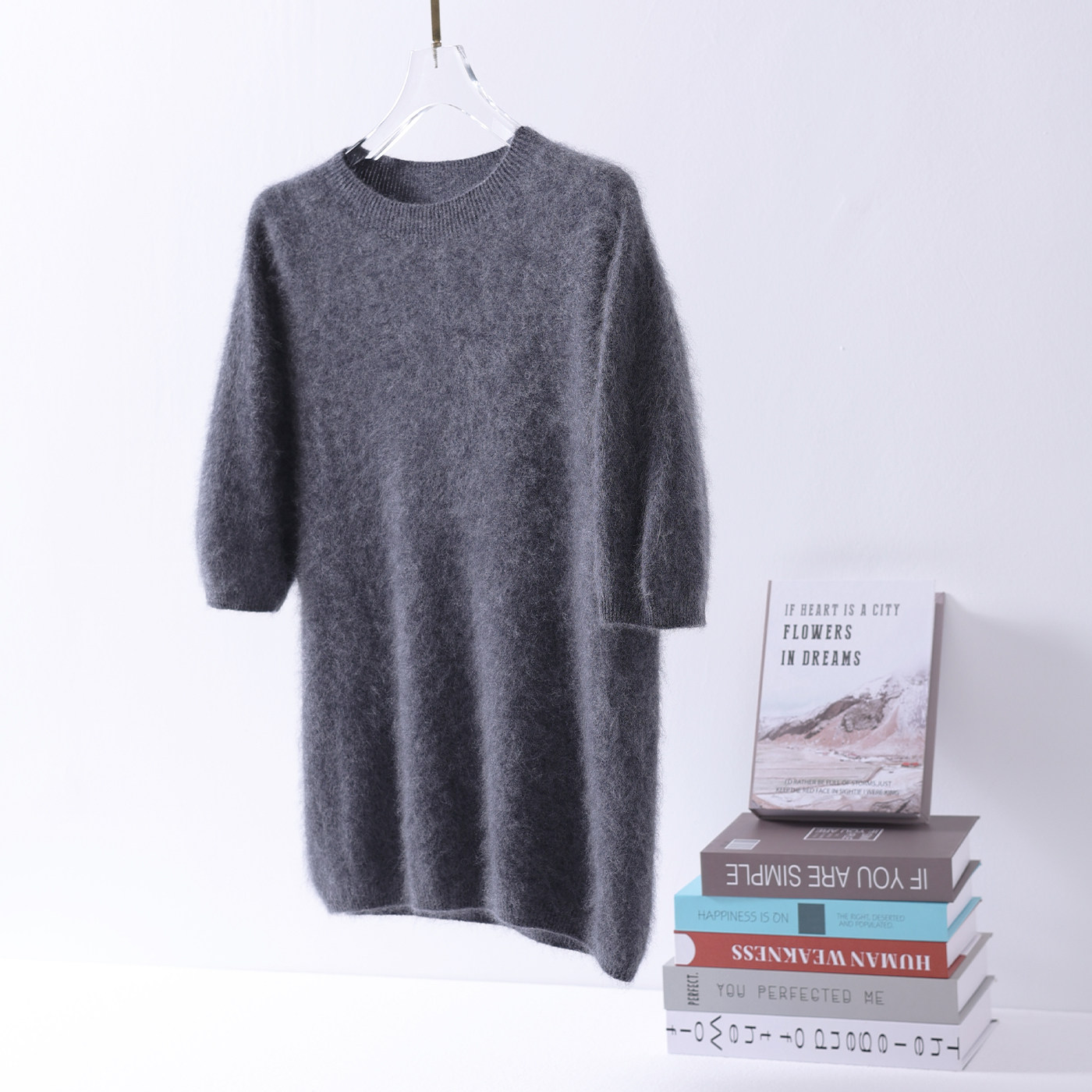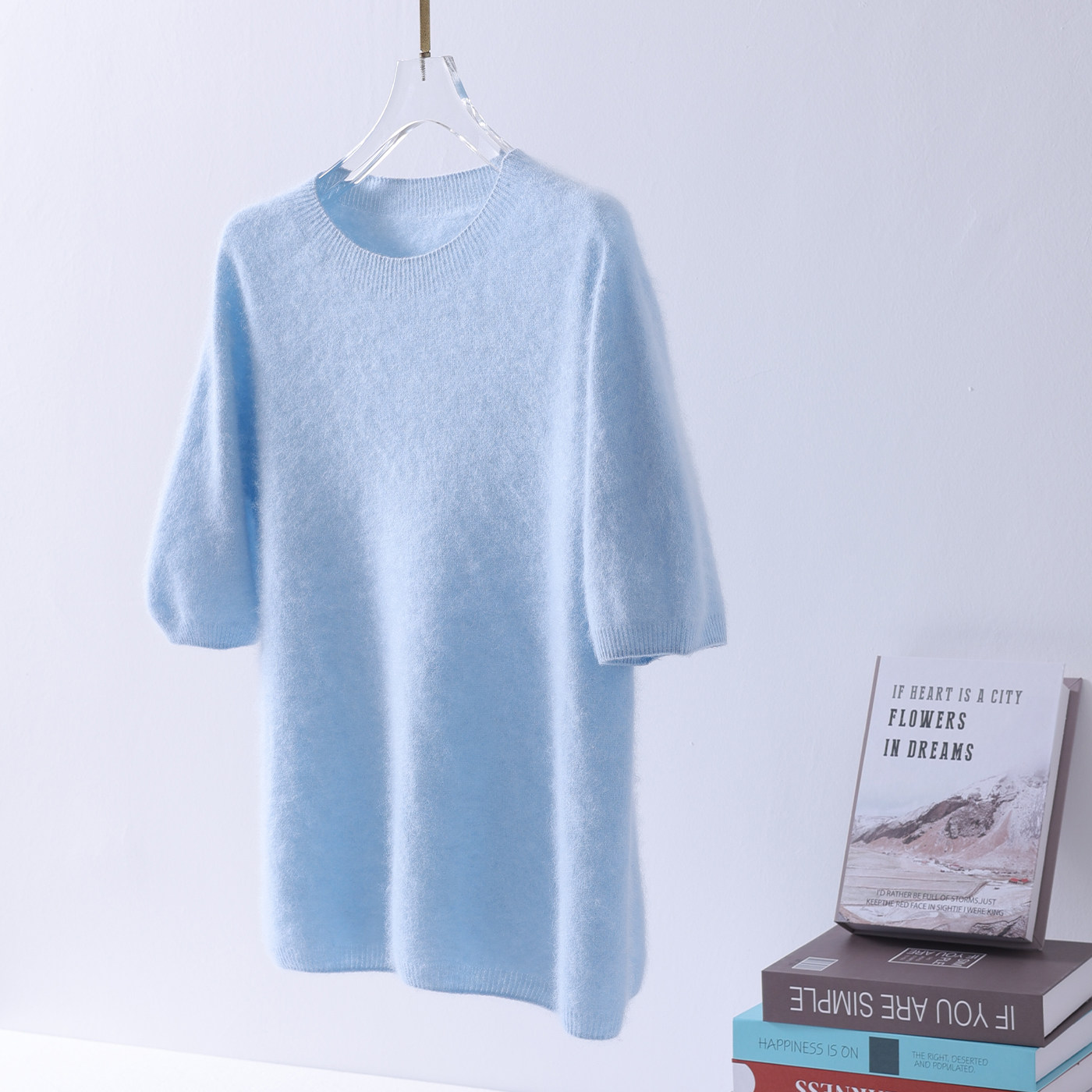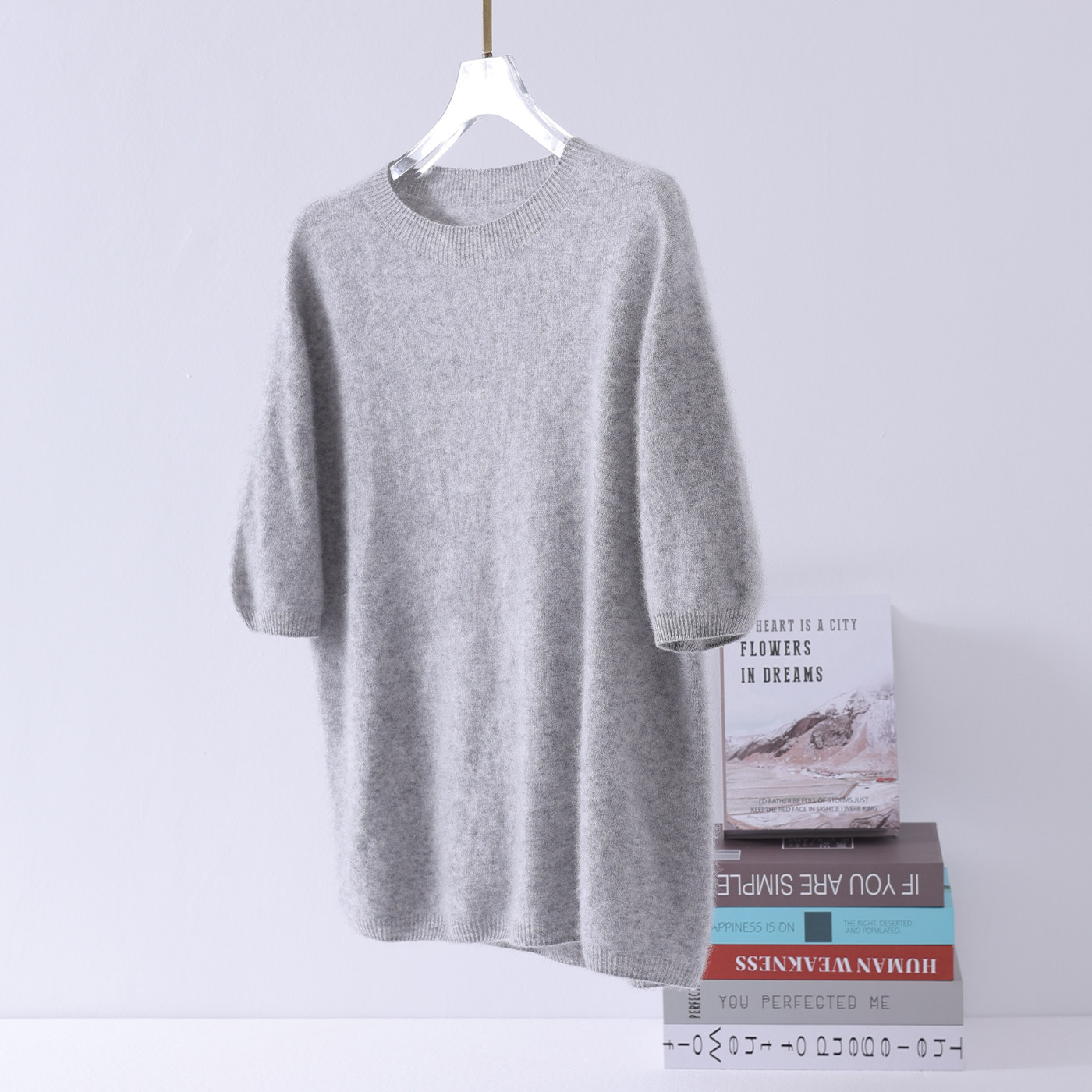 针织毛衣 女圆领无缝一体春秋半袖 软糯亲肤拉毛羊绒羊毛衫 粉色短袖