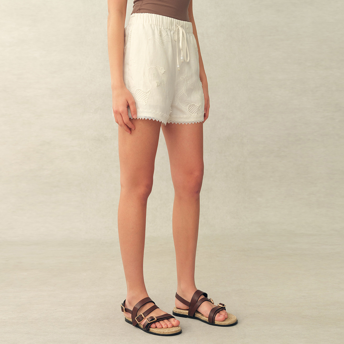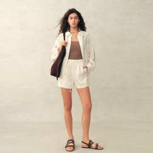 新品 女2026年夏季 铃兰镂空刺绣亚麻松紧腰白色短裤 Fabrique