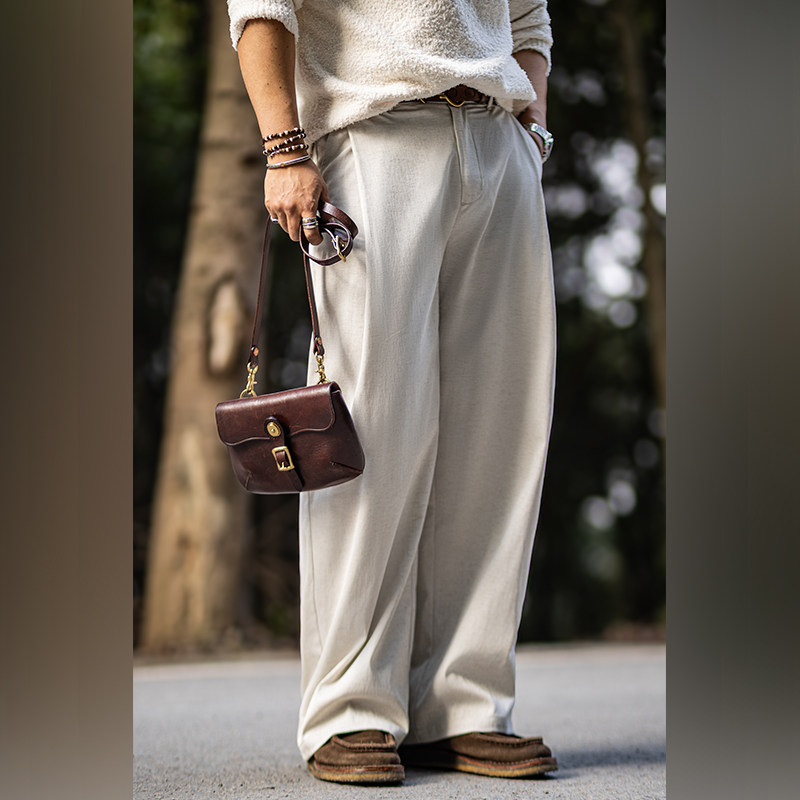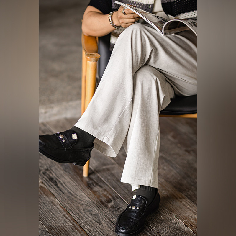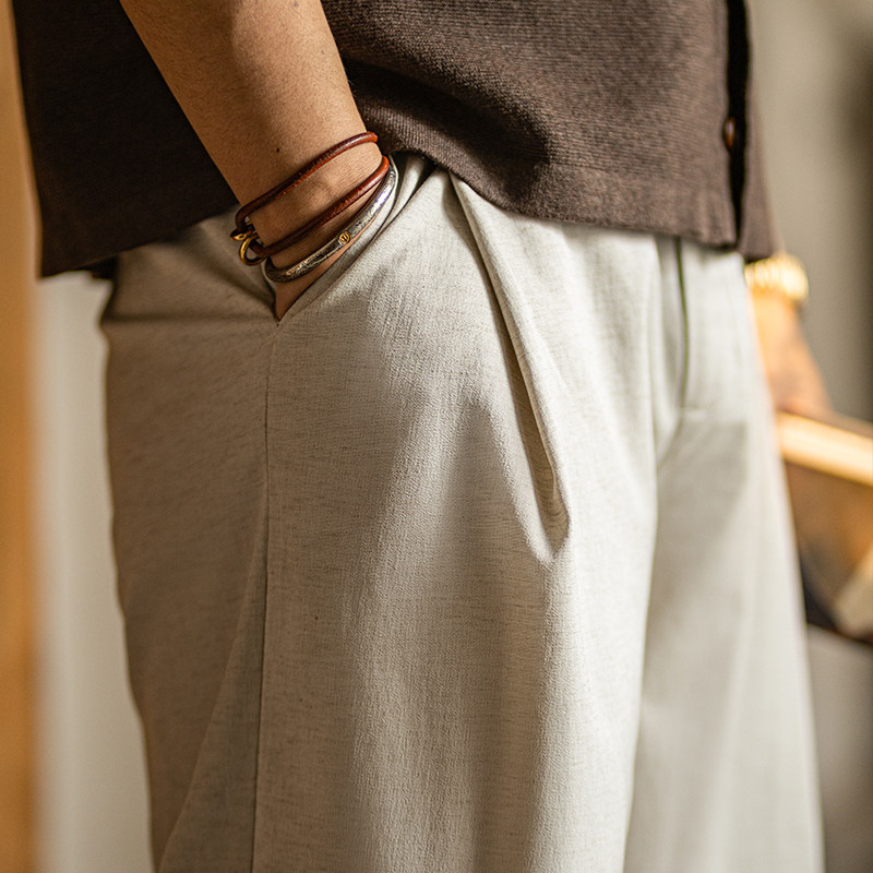 复古亚麻休闲裤 美式 男夏季 新款 古叔 宽松老钱风阔腿直筒西裤 着