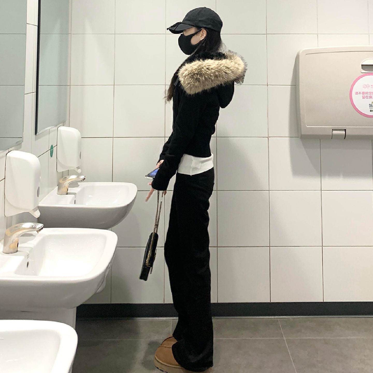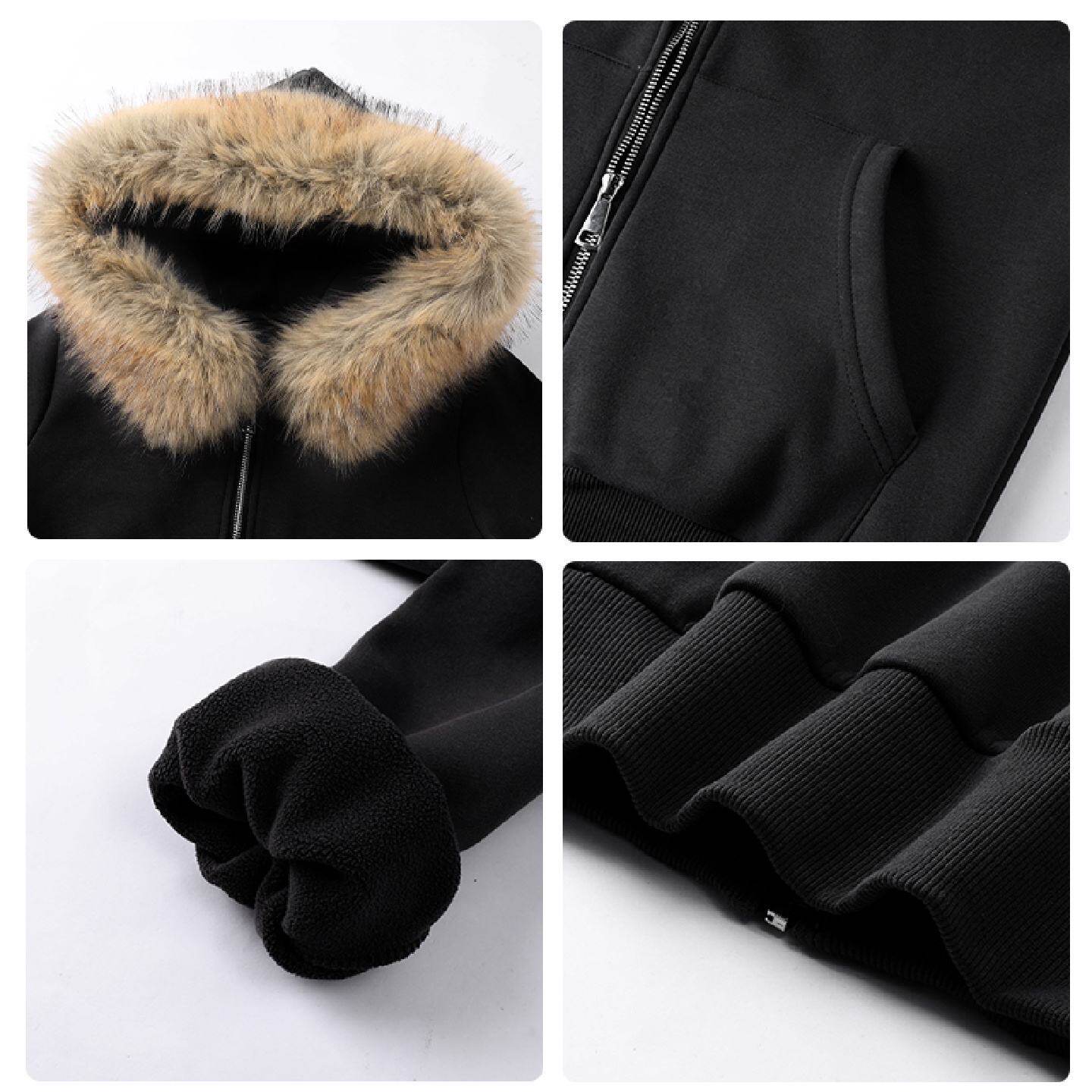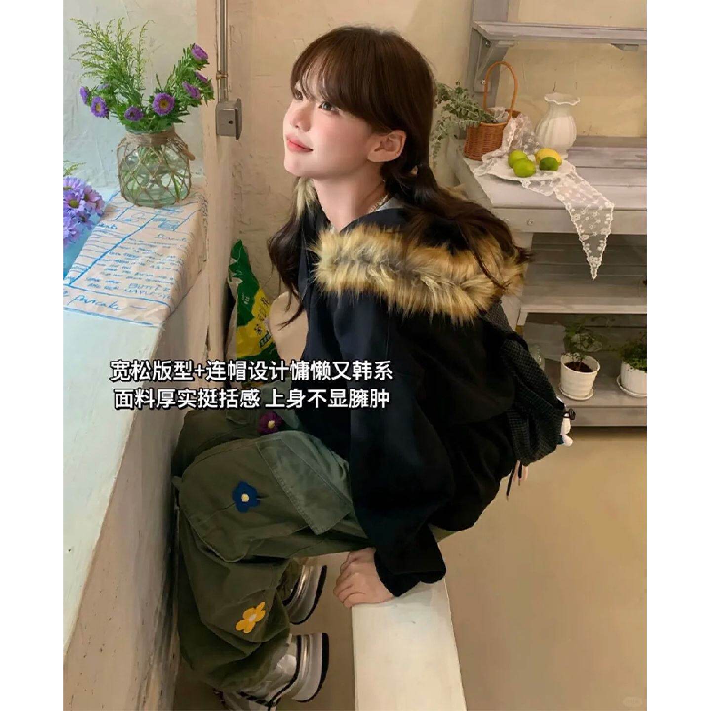 上衣拉链开衫 宽松短款 连帽加绒加厚卫衣美式 黑色毛领外套女秋冬季