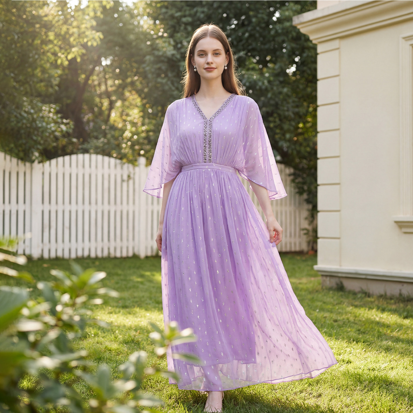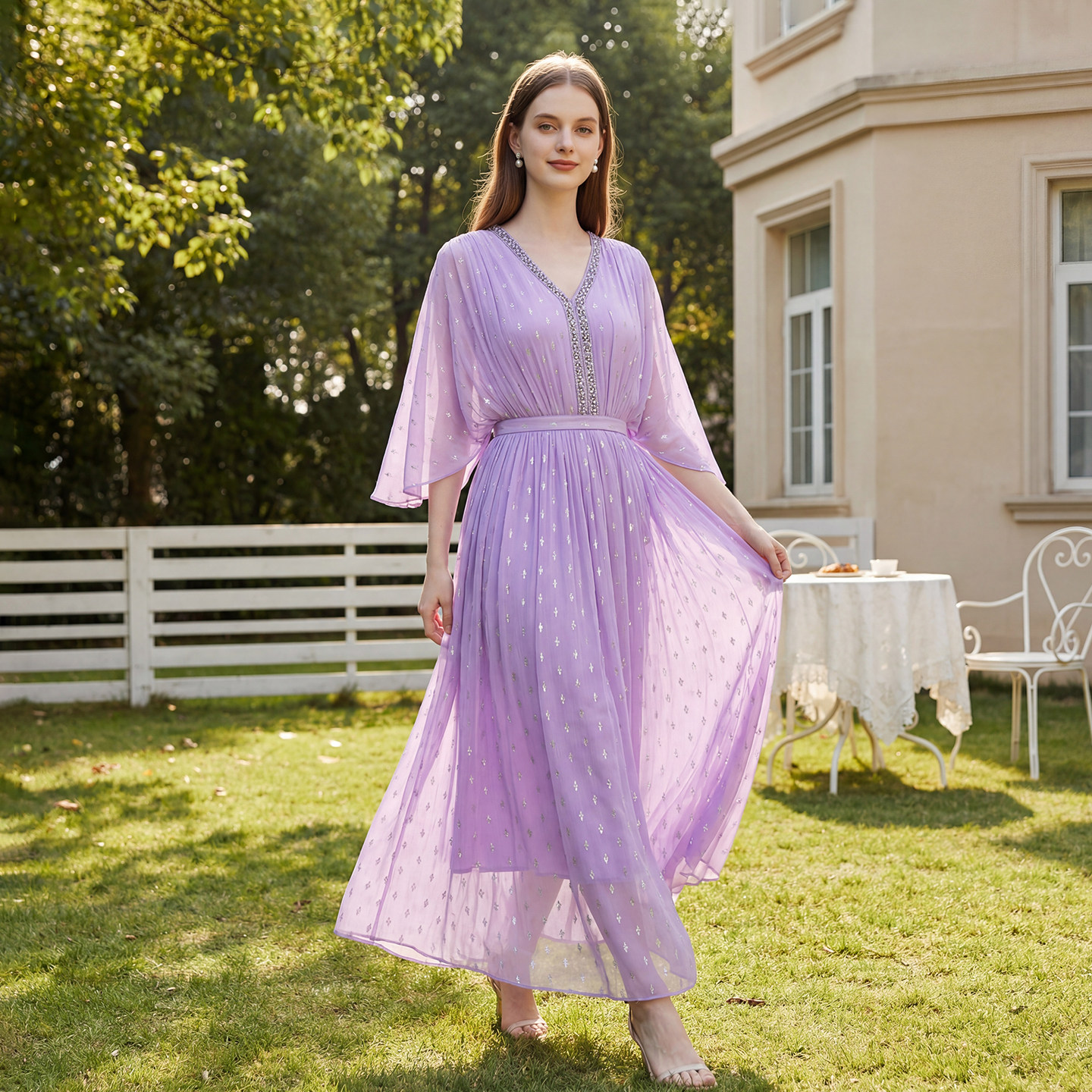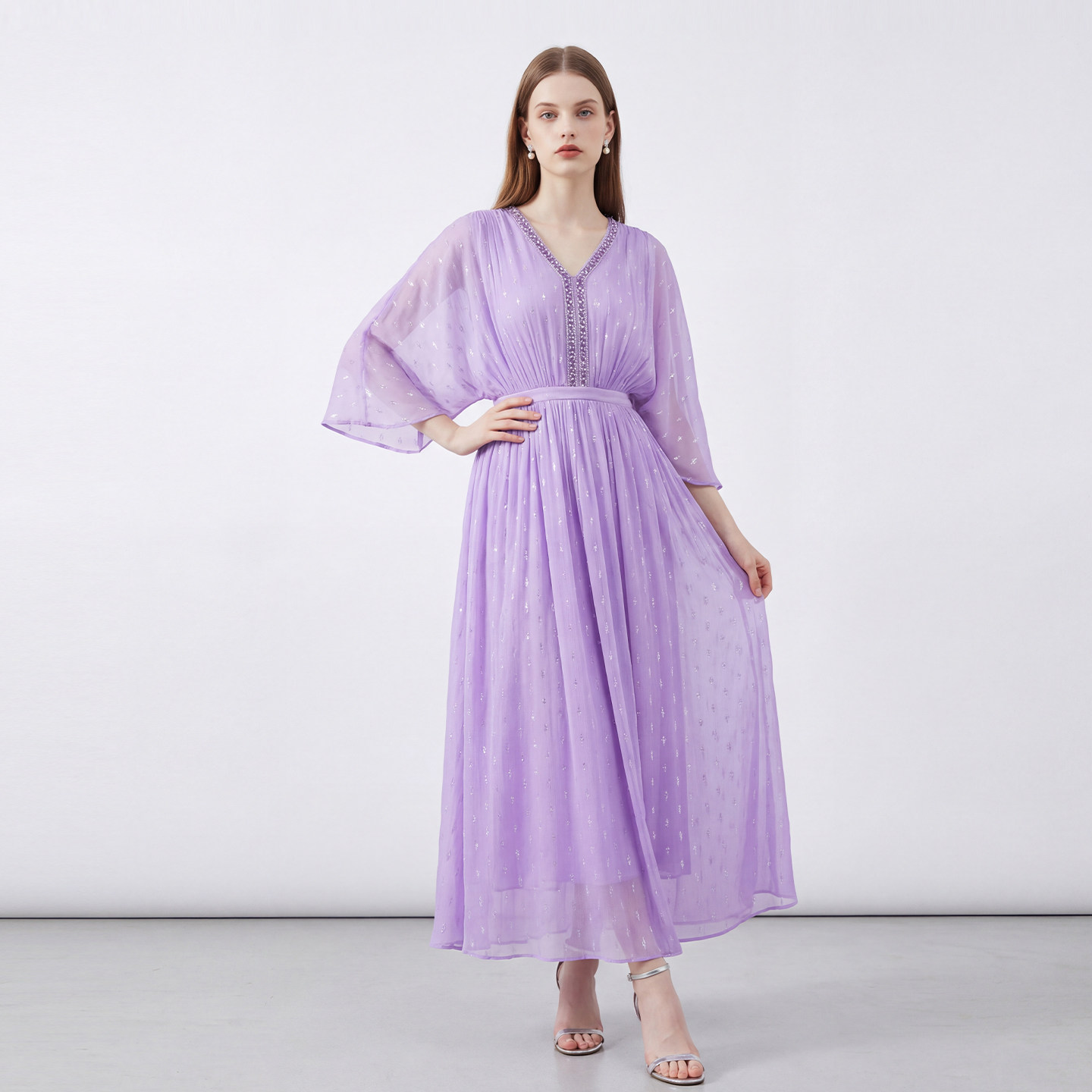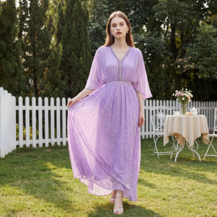 马天奴春夏紫色V领缝钻连衣裙子收腰大摆长裙坠感度假裙季 新款