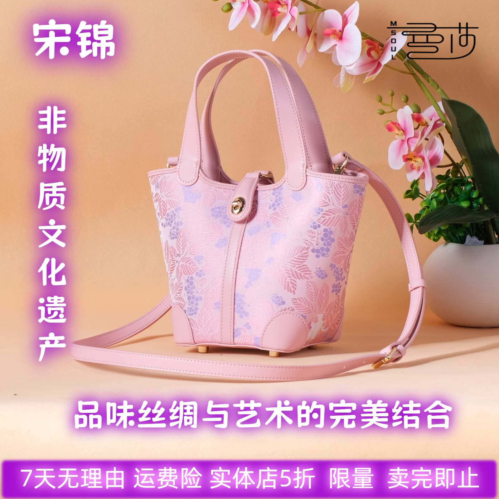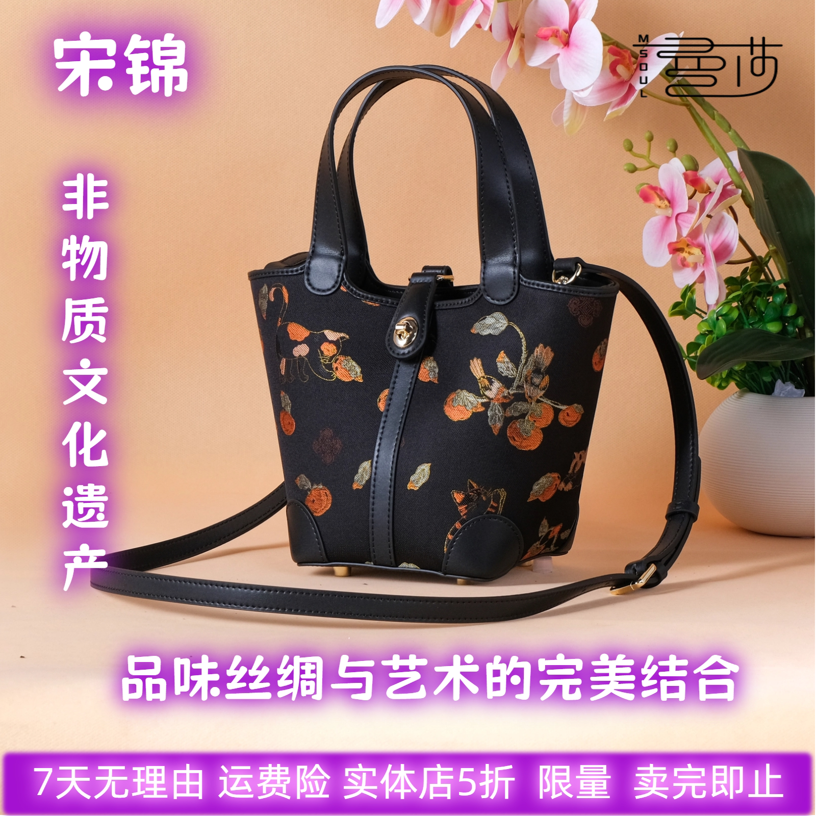 曼莎中国风宋锦香云纱手提单肩斜挎刺绣真丝牛皮手提女包174