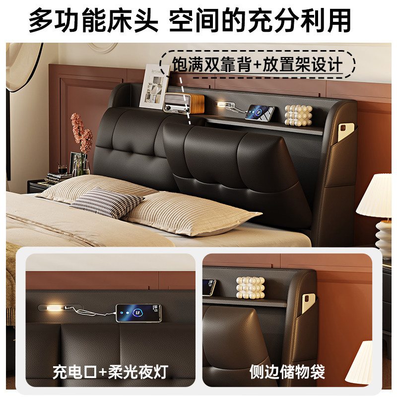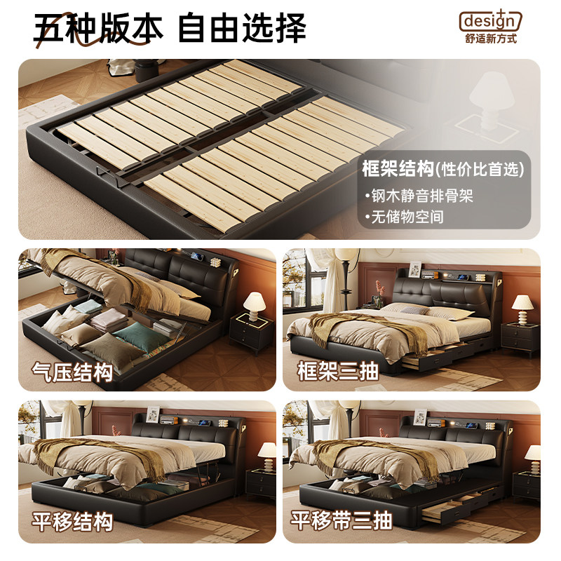 政府补贴蓝色理想真皮主卧床带感应灯平移气压1.8米多功能储物床